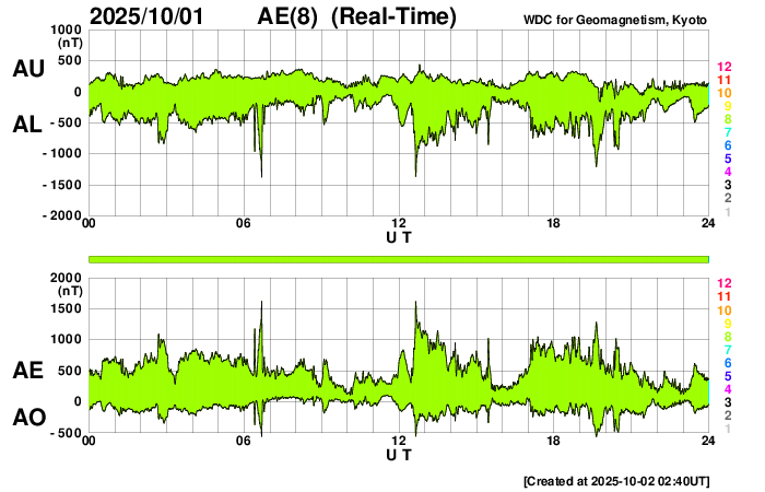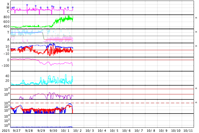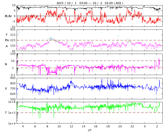 2025/10/ 2 11:57 更新 太陽風は700km/秒の高速の風が続いています。磁気圏も活動的です。 担当 篠原 太陽風は、かなり高速の状態が続いています。 グラフでは、700km/秒から750km/秒へ少し高まり、 その後、700km/秒に戻っています。 磁場強度は、7〜8nTと少し強まった状態が続いています。 磁場の南北成分は、南寄りの傾向が続いていて、 -5nT程度の変化が頻繁に発生しています。 磁気圏の活動は強まっていて、 AE指数は、1000〜1500nTの大きい変化が何度も発生しています。 GOES衛星SUVI 195では、 南半球でコロナホールが東西に長く伸びています。 現在の高速太陽風は、どこまで継続するでしょうか。 700km/秒と大きく高まっていることにも注目して下さい。 太陽は、中心部の4236黒点群で、C8.6の小規模フレア、 4232群で、M1.2の中規模フレアが発生しています。 この領域でCME(コロナ質量放出)が発生すると、 太陽風の乱れは地球へ向かってきます。 しばらく活動に注目して下さい。 また、南東の端(右下)の4226群でも M1.2の中規模フレアが発生しました。