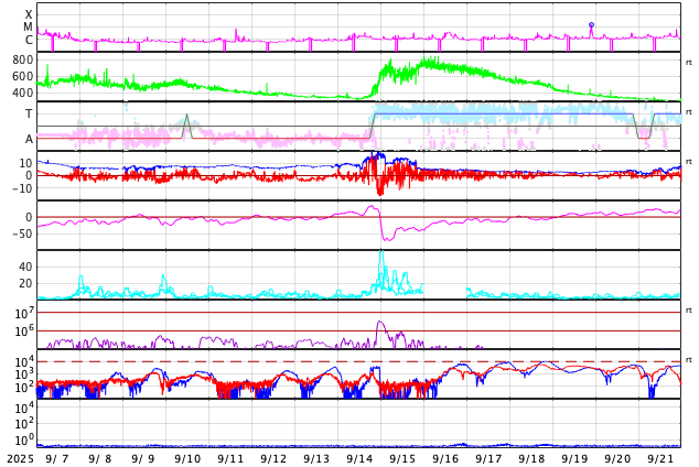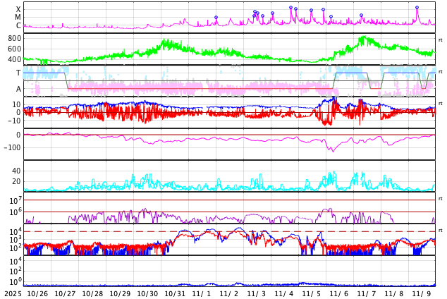 GOES衛星の太陽X線強度。赤・橙 = 0.1〜0.8 nm、青・紫 = 0.05〜0.4 nm (c) データ:NOAA/SWPC、作図:宇宙天気ニュース ![]() | ||||||||||||||||||||||||||||||||||||||||||||||||||||||||||||||||||||||||||||||||||||||||||||||||||||||||||||||||||||||||||||||||||||||||||||||||||||||||||||||||||||||||||||||||||||||||||||||||||||||||||||||||||||||||||||||||||||