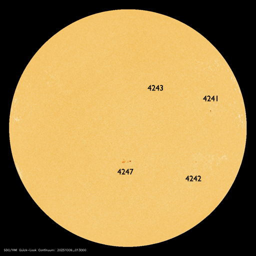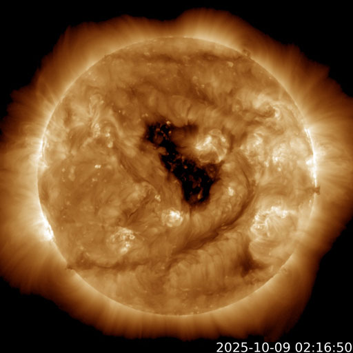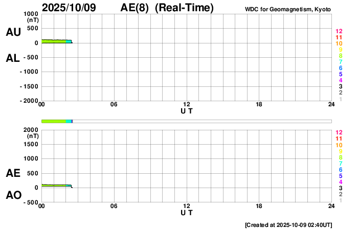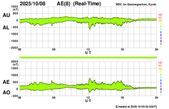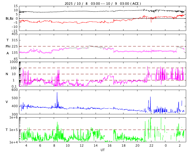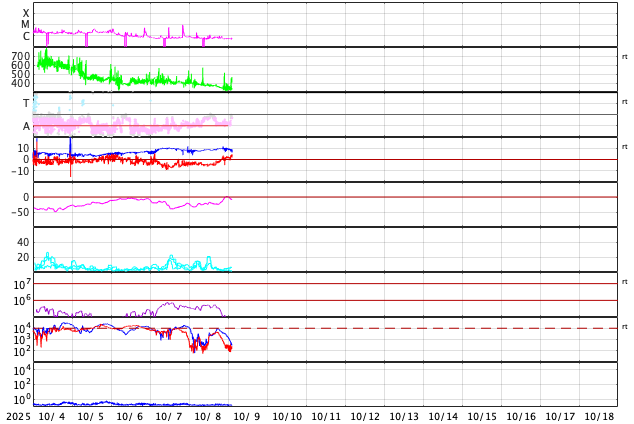 2025/10/ 9 11:53 更新 太陽風は低速になっています。現在の磁気圏は穏やかです。 担当 篠原 太陽風の速度は、400km/秒から340km/秒へ下がり、 低速になっています。 磁場強度は、7nTから10nTへゆっくり強まり、 グラフの最後で少し下がっています。 磁場の南北成分は、グラフの中ほどまでは南向きの状態が続き、 その後北向きにゆっくりと変化しています。 この変化に対応して、 磁気圏の活動は、やや活動的な状態から穏やかな状態に変化しています。 AE指数は、初めは500nT前後の変化が続いていますが、 途中から変化がなくなり、現在はとても穏やかです。 GOES衛星SUVI 195では、 太陽のちょうど真ん中にコロナホールが広がっています。 現在、この領域から地球の方向へ 速度の高い太陽風が吹き出していると思われます。 2日後くらいから太陽風の速度が高まるかもしれません。 注目して下さい。 太陽は穏やかな状態で、X線グラフは目立った変化はありません。 可視光写真は、黒点が少なくなっています。