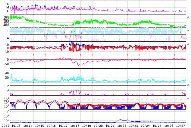 GOES衛星の太陽X線強度。赤・橙 = 0.1〜0.8 nm、青・紫 = 0.05〜0.4 nm (c) データ:NOAA/SWPC、作図:宇宙天気ニュース ![]() | |||||||||||||||||||||||||||||||||||||||||||||||||||||||||||||||||||||||||||||||||||||||||||||||||||||||||||||||||||||||||||||||||||||||||||||||||||||||||||||||||||||||||||||||||||||||||||||||||||||||||||||||||||||||||||||||||||||||||||||||||||||||||||||||