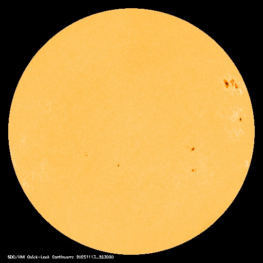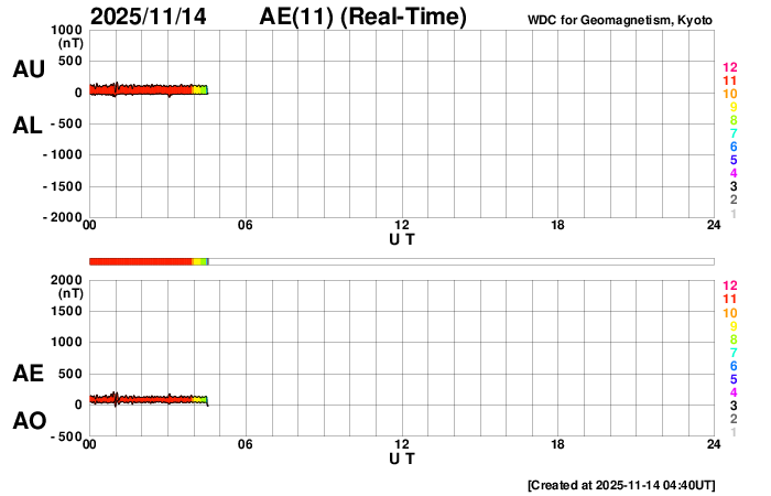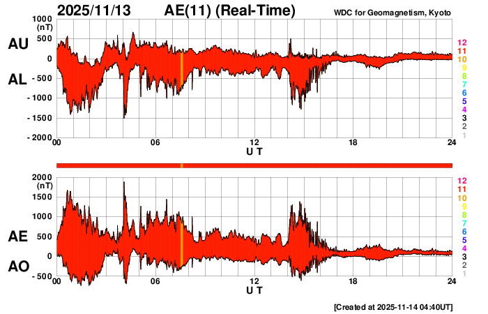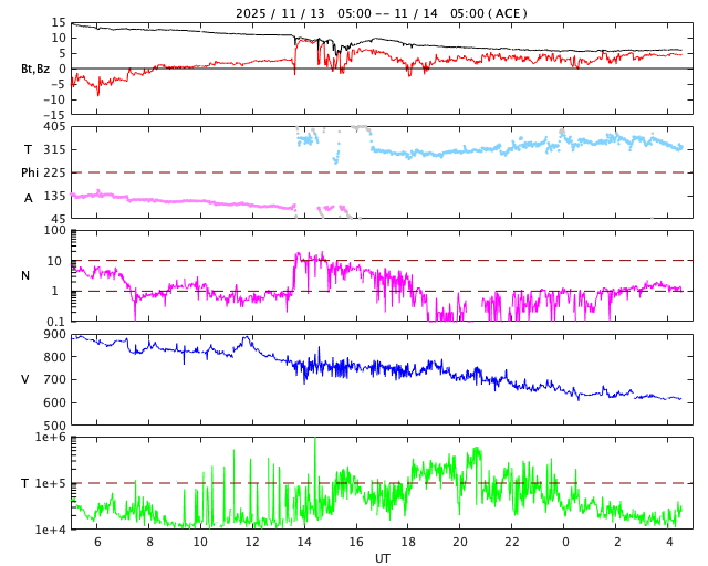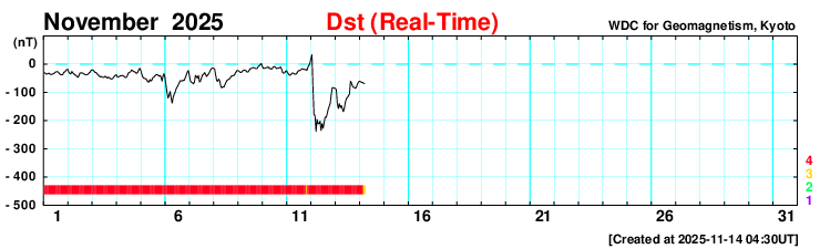 2025/11/14 13:48 更新 高速の太陽風は続いていますが、速度は620km/秒に下がっています。現在の磁気圏は穏やかです。 担当 篠原 950km/秒と非常に高速になっていた太陽風の速度は、 昨日のニュース以降はゆっくりと低下が続き、 現在は620km/秒と、普通の高速風に戻っています。 磁場強度も、20nTと強まった状態から、 現在は6nTと平均的な値に下がっています。 磁場の南北成分は、 グラフの最初に南向きの変化が起きていますが、 以降は、北向きの状態で推移しています。 このため、磁気圏の活動は現在は落ち着いていて、 AE指数を見ると、 グラフの前半は500〜1300nTと活動的な状態ですが、 後半は変化が見られなくなっています。 Dst指数は、現在の数値では、最大の変化は -238nTで、 その後段階的にプラス側に戻り、現在は-60nT付近です。 太陽風の速度はまだ高まった状態ですが、 乱れはこのまま落ち着いて行きそうです。 GOES衛星SUVI 195の太陽コロナ写真では、 中心部の北側にコロナホールが見えています。 明後日くらいからこの領域の影響が始まる可能性があります。 太陽は、南西(右下)の4276黒点群で、 C5.0やC3.9の小規模フレアが起きた程度で、 活動は穏やかになっています。 ![]() 今回の擾乱で、Dst指数は -238nTまで下がりました。現在は -60nT付近に戻っています。 (c) 京都大学WDC ![]() GOES衛星のSUVI 195カメラによる太陽コロナの様子 (c) NOAA/SWPC ![]() SDO衛星による太陽の可視光写真(SOHO衛星の画像ページより取得)。 マウスの矢印を写真に重ねると、黒点番号付きの写真に切り替わります。 (c) SDO (NASA) ![]() ACEが観測した太陽風の磁場(黒線は全体の強度、赤線は南北成分) 磁場の向き、プラズマの密度、速度、温度 (c) データ:NOAA/SWPC、作図:宇宙天気ニュース ![]() AE指数(速報値) 下段のAEグラフの値が高くなると、オーロラ活動が活発化しています。 (c) 京都大学WDC ![]() ![]() 27日の太陽周期に合わせた図 太陽が同じ面を地球に向けていた27日前の変化から、今後を予想することができます。 (c) 作図:宇宙天気ニュース