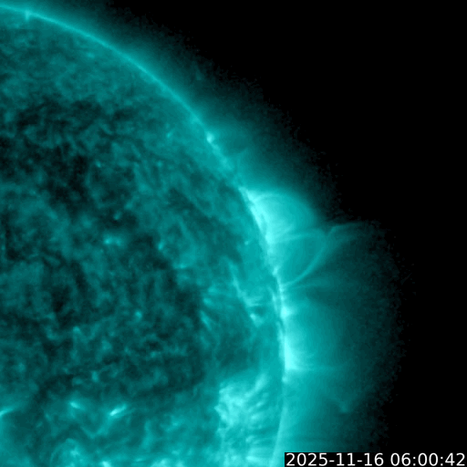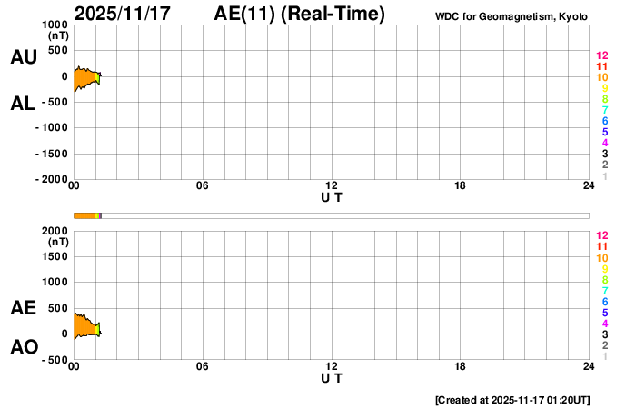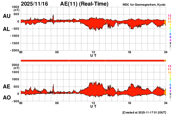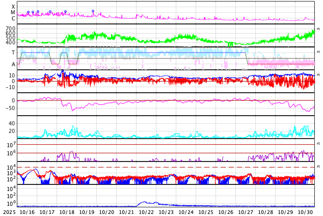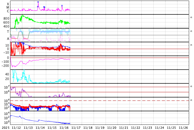 2025/11/17 10:21 更新 太陽風の速度は700km/秒まで高まり、現在も530km/秒と高速です。 担当 篠原 太陽風は、昨日の昼過ぎ、 16日13時半(世界時16日4時半)に次の高まりがやって来て、 速度は、600km/秒から700km/秒へ、 磁場強度は、8nTから15nTへ、それぞれ高まっています。 14日のX4.0大規模フレアのCME(コロナ質量放出)に 関係する変化かもしれません。 その後、速度は次第に低下して、 現在は530km/秒と高速の状態は続いています。 磁場強度は、5nTと平均的な値に戻っています。 磁場の南北成分は、太陽風が強まった直後は北向きでしたが、 その後、弱い南寄りに変わっています。 この頃から磁気圏の活動が高まって、 AE指数は、500〜800nTの中規模の変化が続いています。 GOES衛星SUVI 195では、 北半球のコロナホールは、北西側(右上)にだいぶ進んでいます。 この領域の影響も次第に弱まって行くでしょう。 太陽は、昨夕、16日17時(世界時16日8時)に、 北西の端(右上)の少し向こう側で、 M3.1の中規模フレアが発生しました。 向こう側へ進んだ4274黒点群で発生した様です。