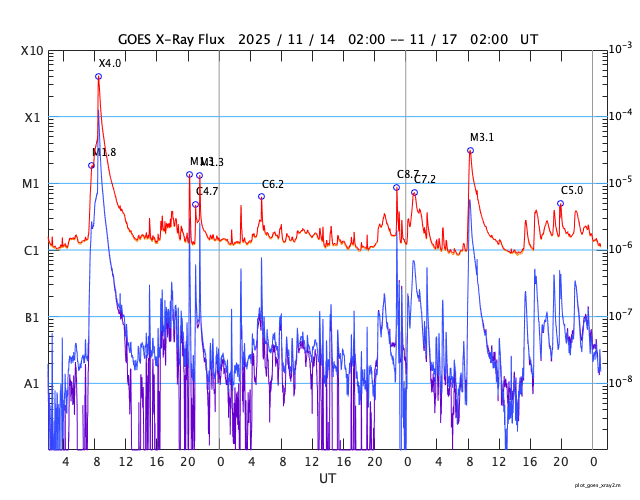 GOES衛星の太陽X線強度。赤・橙 = 0.1〜0.8 nm、青・紫 = 0.05〜0.4 nm (c) データ:NOAA/SWPC、作図:宇宙天気ニュース ![]() | |||||||||||||||||||||||||||||||||||||||||||||||||||||||||||||||||||||||||||||||||||||||||||||||||||||||||||||||||||||||||||||||||||||||||||||||||||||||||||||||||||||||||||||||||||||||||||||||||||||||||||||||||||||||||||||||||||||||||||||||||||||||||||||||||||||||||||