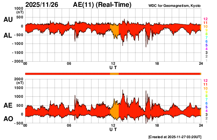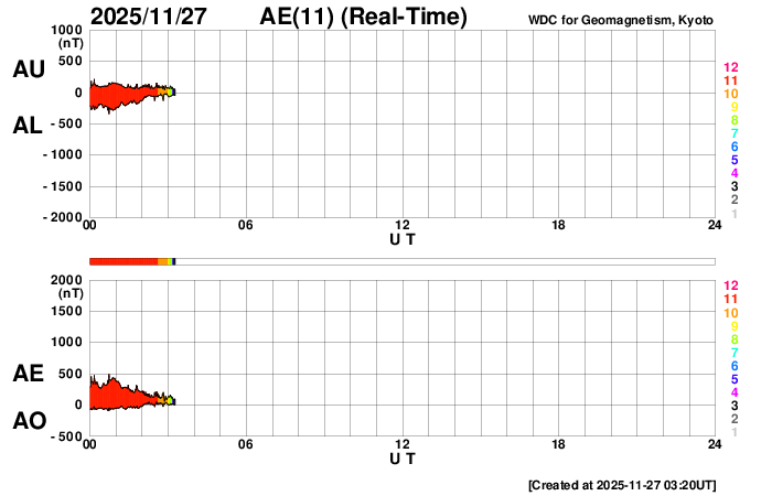 2025/11/27 12:22 更新 太陽風は700km/秒と高速の状態が続いています。磁気圏も活動的です。 担当 篠原 太陽風の速度は、800km/秒近い状態から少し下がり、 700km/秒付近で推移しています。 かなり高まった状態は続いています。 磁場強度は、5〜6nTと平均的な状態です。 磁場の南北成分は、南北にゆっくりと変化しています。 速度が高まっていることもあり、 磁気圏は活動的な状態が続いていて、 AE指数は、500〜1000nTの中規模の変化が続いています。 GOES衛星SUVI 195では、 コロナホールは、西の端(右端)に次第に近付いています。 コロナホールの影響は、この後は下がっていきそうです。 太陽は、穏やかな状態が続いています。 フレアは、中心部南東側(左下)の4291黒点群で、 C2.7の小規模フレアが発生した程度です。
