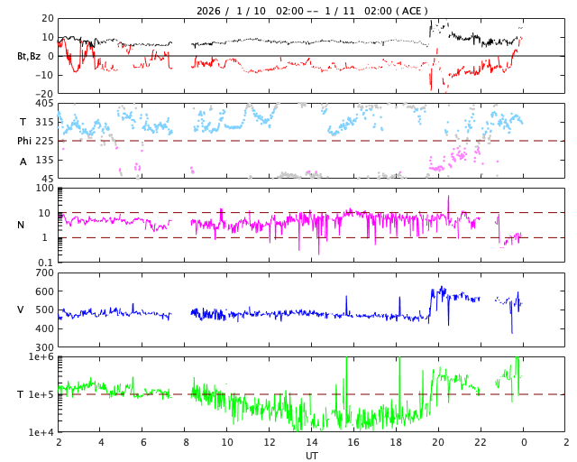 2026/ 1/11 10:05 更新 CMEによる太陽風の乱れが到来しました。磁場が南向きに強まって磁気圏の活動が強まりました。 担当 篠原 9日未明のCME(コロナ質量放出)による太陽風の乱れが、 今朝、11日4時半(世界時10日19時半)にACE衛星で観測され、 太陽風の速度は600km/秒に高まりました。 昨日のニュースの後も、 太陽風の速度は480km/秒とやや高速の状態が続きました。 磁場強度は6〜8nTと少し強まっていたのですが、 磁場の南北成分が10日13時(世界時10日4時)頃から南向きの傾向になり、 -7nT前後の状態が今朝にかけて続きました。 このため、磁気圏の活動は強まって、 AE指数は、グラフの途中から 1000nTに達する大きい変化が連続的に発生しています。 ここにCMEによる太陽風の乱れが到来して、 速度は600km/秒に、磁場強度は15nTに高まりました。 磁場の南北成分は、-10nTと南向きにさらに強まっています。 磁気圏の活動も規模が大きくなって、 AE指数は1500nTに達する激しい変化が発生しています。 乱れの到来から5時間ほど経った現在では、 太陽風の速度は520km/秒と、高速ですが勢いは下がっています。 磁場強度は、一旦7nTに下がりましたが、 グラフの最後で再び15nTに強まっています。 ただし、磁場の南北成分は北向きに変化していて 磁気圏への影響は下がっています。 AE指数もグラフの最後は500nTの変化に下がっています。 CMEによる太陽風の乱れは長くは続かないと思われるので、 太陽風はこの後、到来前の状態に戻って行きそうです。 一方、SDO衛星AIA193では、 北半球を縦に伸びるコロナホールが太陽の中心線付近で見えています。 この広がりの影響が3日後くらいに地球に到来して、 太陽風の速度が高まりそうです。 太陽は、北西の端(右上)近くの4337黒点群で、 C3.8、C2.0の小規模フレアが発生しています。 可視光写真では、東側(左側)に黒点はなく、 太陽は穏やかに推移しそうです。