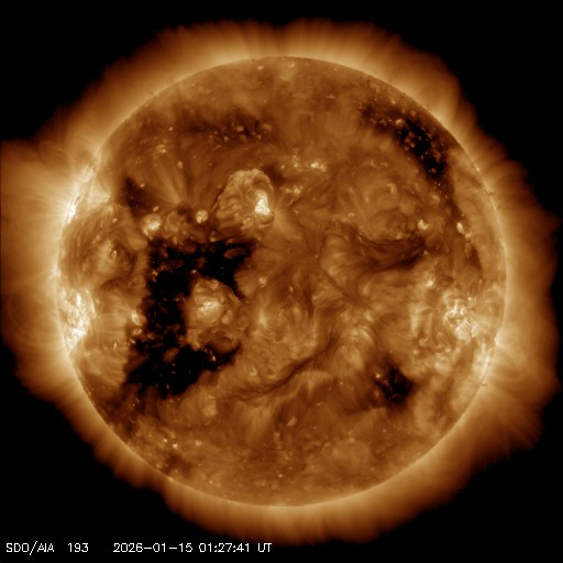 2026/ 1/16 13:59 更新 太陽風の速度は700km/秒に高まっています。 担当 篠原 太陽風の速度は、昨日の午後から600km/秒に高まり、 グラフの最後では700km/秒まで高まっています。 磁場強度は、5〜7nTで推移していましたが、 こちらもグラフの最後で12nTに強まり、今は8nT程度です。 コロナホールとの関係はよく分かりません。 SDO衛星AIA193では、 太陽の西側(右側)にはコロナホールの大きい広がりは見えていません。 中心部から南東側(左下)にかけてコロナホールが見えていますが、 この影響としては早すぎると思います。 この後、太陽風はどの様に変化するでしょうか。 太陽風磁場の南北成分は、0nT付近で南北に小さく変化しています。 速度が高まっているためか、磁気圏の活動はある程度高まっていて、 AE指数は、500nTに達する変化が度々発生しています。 太陽は、南東の4341黒点群で、 15日15時半(世界時15日6時半)にC9.7の小規模フレアが発生しましたが、 以降は目立った変化はなく、穏やかな状態です。