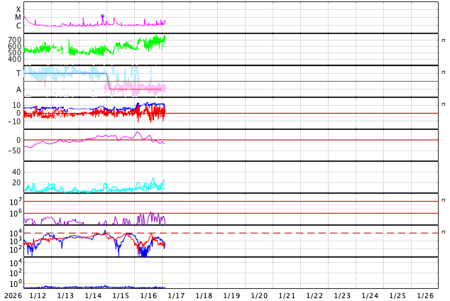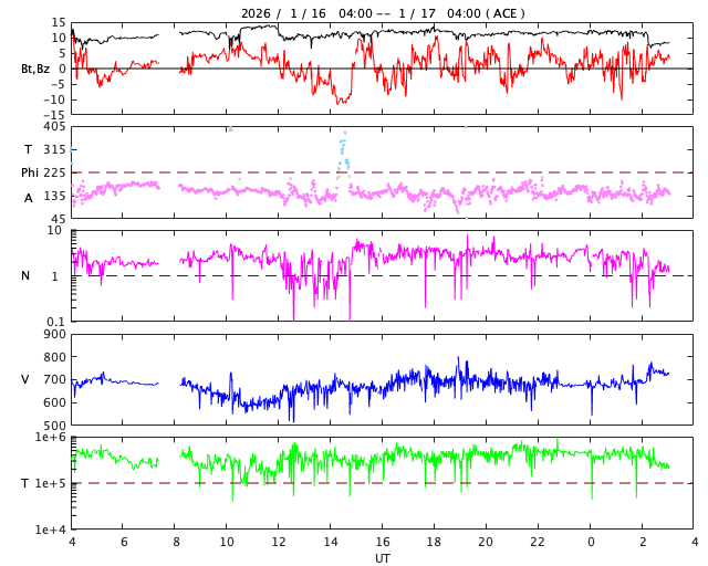 2026/ 1/17 12:12 更新 太陽風は700km/秒と高速の状態が続いています。磁気圏の活動も強まっています。 担当 篠原 太陽風の速度は、 680〜700km/秒とかなり高まった状態が続いています。 磁場強度も12nTに強まった状態で推移しています。 磁場の南北成分は、ゆっくり南北に変化する状態になっています。 速度の高まりもあり、磁気圏の活動は強まっていて、 AE指数は、500〜1000nTの中規模の変化が続き、 1500nTを超える大きい変化も発生しています。 SDO衛星AIA193では、 縦に広がるコロナホールが太陽の中心部に達しています。 現在の高速風に続く様に、この領域の影響が始まりそうです。 27日周期の図を参考にすると、高速風は24日頃まで続くかもしれません。 太陽は、南東(左下)の4345黒点群でC6.6、 中心部南西(右下)の4343群でC4.0、C5.2、C3.1、 そして、グラフの最後で南東の4341群でC4.4、 ほぼ同時に南西の端の4336群でC4.7 など、小規模フレアの発生が続く様になっています。