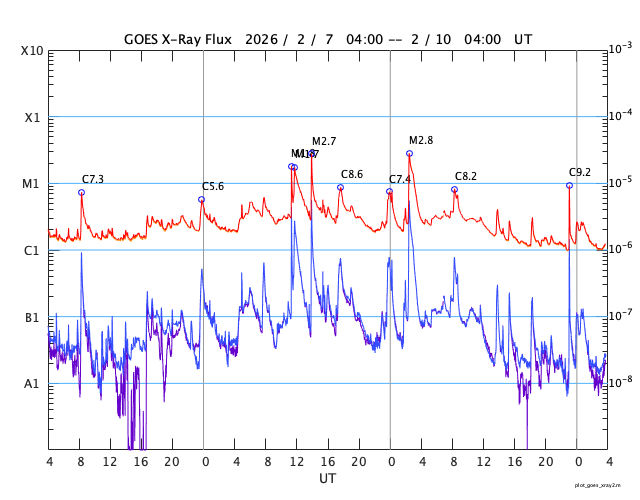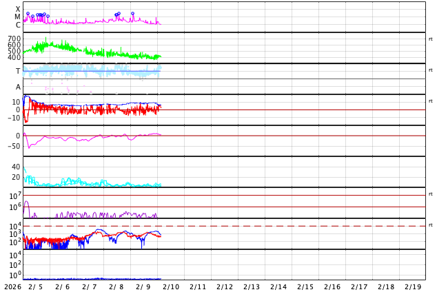 GOES衛星の太陽X線強度。赤・橙 = 0.1〜0.8 nm、青・紫 = 0.05〜0.4 nm (c) データ:NOAA/SWPC、作図:宇宙天気ニュース ![]() | ||||||||||||||||||||||||||||||||||||||||||||||||||||||||||||||||||||||||||||||||||||||||||||||||||||||||||||||||||||||||||||||||||||||||||||||||||||||||||||||||||||||||||||||||||||||||||||||||||||||||||||||||||||||||||||||||||||||||||||||||||||||||||||||||||||||||||