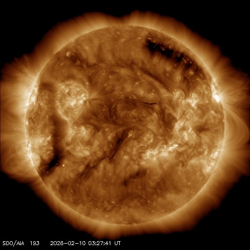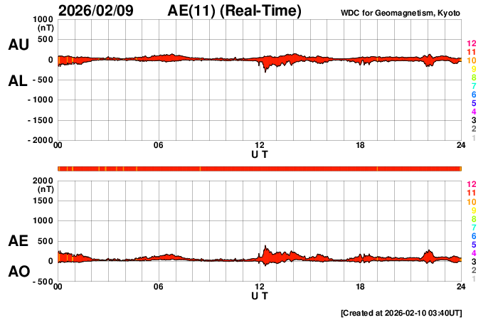 2026/ 2/10 12:51 更新 太陽風は平均的な状態で、磁気圏も穏やかです。 担当 篠原 太陽風は、400km/秒と平均的な速度が続いています。 磁場強度は、9nTに少し強まっていましたが、 グラフの最後で6nTに下がり、平均的な値に戻っています。 磁場の南北成分は、0nT付近で変化しています。 磁気圏は穏やかで、AE指数は小さい変化が時々発生する程度です。 SDO衛星AIA193では、 北西側(右上)のコロナホールは太陽の端に近づいていて、 影響は特に見られないままになりそうです。 一方、南東の端(左下)に縦に伸びるコロナホールが見えています。 この領域は、27日前の前周期とは位置や広がりがだいぶ変わっています。 現在の広がりはどのようになっているでしょうか。 太陽は、今朝、10日8時(9日23時)に、 北東の端(左上)の4374黒点群で、 C9.2と大きい小規模フレアが発生しました。 目立った変化はこのくらいで、全体としては穏やかな状態です。