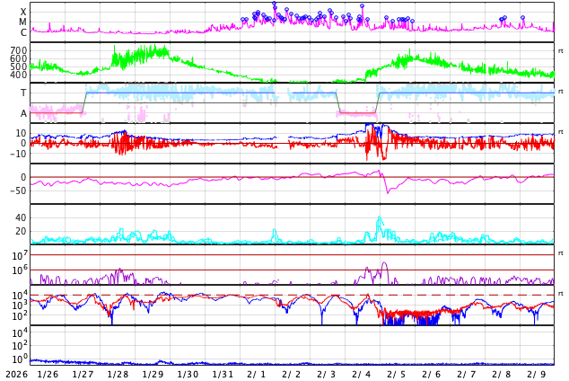 GOES衛星の太陽X線強度。赤・橙 = 0.1〜0.8 nm、青・紫 = 0.05〜0.4 nm (c) データ:NOAA/SWPC、作図:宇宙天気ニュース ![]() | ||||||||||||||||||||||||||||||||||||||||||||||||||||||||||||||||||||||||||||||||||||||||||||||||||||||||||||||||||||||||||||||||||||||||||||||||||||||||||||||||||||||||||||||||||||||||||||||||||||||||||||||||||||||||||||||||