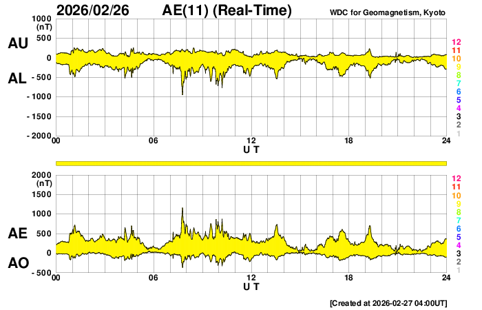 2026/ 2/27 13:12 更新 太陽風の速度は470km/秒に下がり、高速風は終わろうとしています。 担当 篠原 太陽風の速度は、 550km/秒から470km/秒へゆっくりと低下しています。 高速の太陽風は終わりを迎える様です。 磁場強度は、5nTから4nTへ少し下がっています。 南北成分は、弱い南寄りの傾向が続いています。 磁気圏では活動が続いていて、 AE指数は500nTを超えるくらいの変化が次々に発生しています。 ただし、グラフの最後は300nTの変化に留まっていて、 太陽風の速度が下がってきた影響があるのかもしれません。 SDO衛星AIA193では、太陽の中心部にコロナホールはなく、 南半球の高緯度域に大きい広がりが見えています。 太陽風はしばらく穏やかになりそうです。 太陽は、C6.3の小規模フレアが、 東の端(左端)の少し向こう側で発生しました。 この後、黒点が現れるでしょうか。 その他は、目立った活動は起きていません。 ![]() SDO衛星のAIA193カメラによる太陽コロナの様子 (c) SDO (NASA) ![]() SDO衛星による太陽の可視光写真。マウスの矢印を写真に重ねると、黒点番号付きの写真に切り替わります。 (c) SDO (NASA) ![]() ACEが観測した太陽風の磁場(黒線は全体の強度、赤線は南北成分) 磁場の向き、プラズマの密度、速度、温度 (c) データ:NOAA/SWPC、作図:宇宙天気ニュース ![]() AE指数(速報値) 下段のAEグラフの値が高くなると、オーロラ活動が活発化しています。 (c) 京都大学WDC ![]() ![]() 27日の太陽周期に合わせた図 太陽が同じ面を地球に向けていた27日前の変化から、今後を予想することができます。 (c) 作図:宇宙天気ニュース