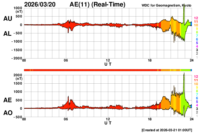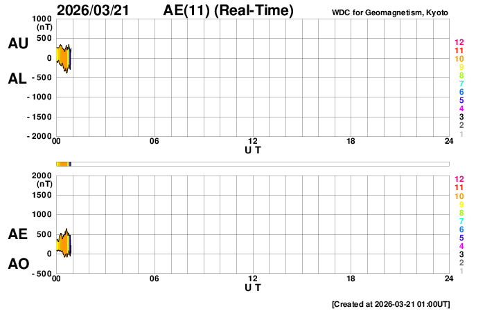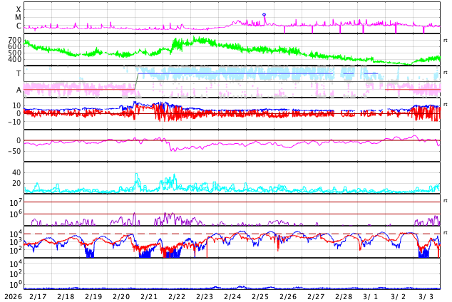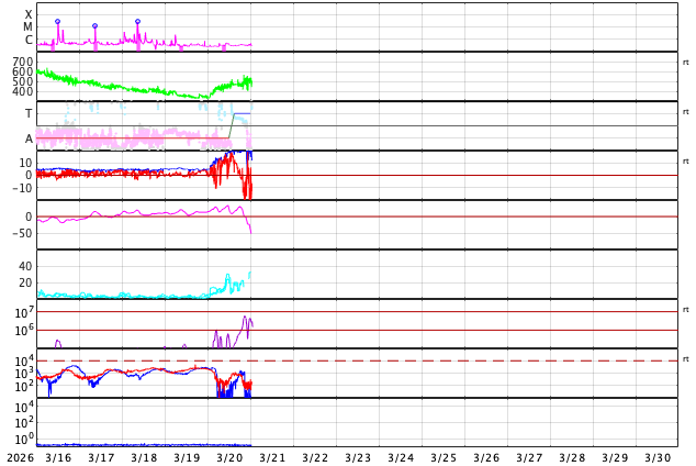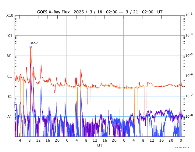 GOES衛星の太陽X線強度。赤・橙 = 0.1〜0.8 nm、青・紫 = 0.05〜0.4 nm (c) データ:NOAA/SWPC、作図:宇宙天気ニュース ![]() | ||||||||||||||||||||||||||||||||||||||||||||||||||||||||||||||||||||||||||||||||||||||||||||||||||||||||||||||||||||||||||||||||||||||||||||||||||||||||||||||||||||||||||||||||||||||||||||||||||||||||||||||||