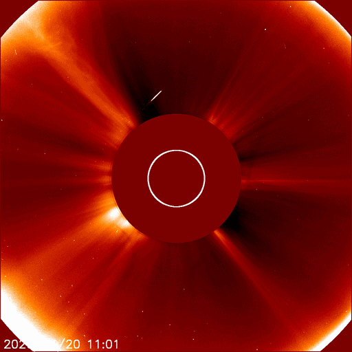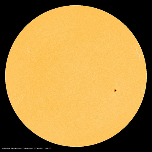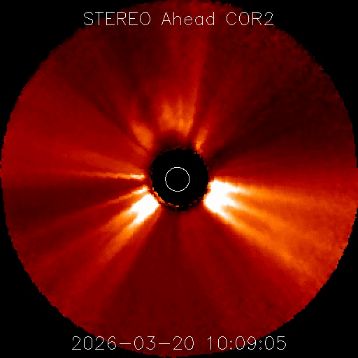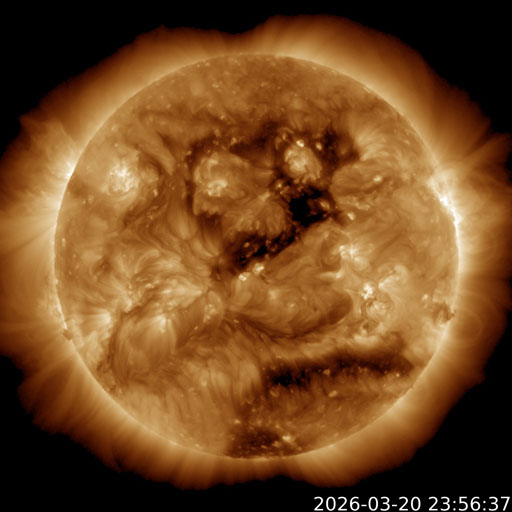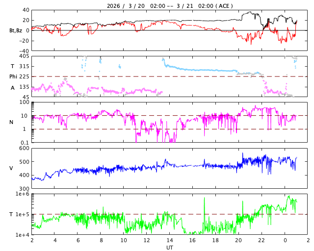 2026/ 3/21 10:17 更新 太陽風の速度は500km/秒に高まり、磁気圏の活動が活発になっています。 担当 篠原 昨日のニュースの後、太陽風は更に強まって、 速度は450km/秒に高まり、 今朝早くには500km/秒と高速の状態に達しています。 磁場も大きく変化していて、 磁場強度は20nTに強まって、 グラフの後半では、35nTとかなり大きい変化も発生しています。 南北成分は、グラフの中盤までは北向きに強まっていましたが、 後半では、-15 〜 -20nTとかなり大きい南向きの強まりが発生しています。 太陽風の後半の強まりは、19日のニュースでお知らせした 18日夕方のCME(コロナ質量放出)に関係する乱れが、 2日半ほどかけて地球に到来したのかもしれません。 磁気圏の活動は、今朝早くから急に活発になっています。 AE指数は、中盤までは磁場が北向きだったため変化は小さかったのですが、 後半の磁場が南を向いたところで、 1000nTに達する大きい変化が発生しています。 現在は速度も高まっているので、磁場の南向きの強まりが続けば、 磁気圏の変化も活発な状態が続くでしょう。 GOES衛星SUVI 195では、 北半球のコロナホールが西側(右側)に進んでいます。 この領域の影響も現在の変化に重なりそうです。 コロナホールの最後(左端)が太陽の中心線付近に達しているので、 影響はもう3〜4日程度でしょうか。 太陽はとても穏やかで、 X線グラフはほとんど変化のない状態です。 一方、向こう側では活動が起きている様で、 昨夜、20日22時(世界時20日13時)頃に、 SOHO衛星LASCO C2、C3で、 太陽を丸く囲む様に広がるハロー型のCMEが観測されています。 太陽を地球よりも右斜めから観測している STEREO Ahead衛星COR2を見ると、 CMEは太陽の向こう側にあたる右側に広がっています。 ![]() 太陽の向こう側で発生したハロー型のCME。 (c) SOHO衛星LASCO C2、C3 (ESA & NASA)、(動画加工 : 宇宙天気ニュース) ![]() STEREO Ahead衛星では、CMEは太陽の右側に広がっている。 (c) STEREO Ahead衛星COR2 (NASA)、(動画加工 : 宇宙天気ニュース) ![]() GOES衛星のSUVI 195カメラによる太陽コロナの様子 (c) NOAA/SWPC ![]() SDO衛星による太陽の可視光写真(SOHO衛星の画像ページより取得)。 マウスの矢印を写真に重ねると、黒点番号付きの写真に切り替わります。 (c) SDO (NASA) ![]() ACEが観測した太陽風の磁場(黒線は全体の強度、赤線は南北成分) 磁場の向き、プラズマの密度、速度、温度 (c) データ:NOAA/SWPC、作図:宇宙天気ニュース ![]() AE指数(速報値) 下段のAEグラフの値が高くなると、オーロラ活動が活発化しています。 (c) 京都大学WDC ![]() ![]() 27日の太陽周期に合わせた図 太陽が同じ面を地球に向けていた27日前の変化から、今後を予想することができます。 (c) 作図:宇宙天気ニュース