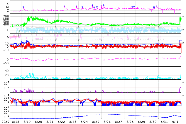 GOES衛星の太陽X線強度。赤・橙 = 0.1〜0.8 nm、青・紫 = 0.05〜0.4 nm (c) データ:NOAA/SWPC、作図:宇宙天気ニュース ![]() | |||||||||||||||||||||||||||||||||||||||||||||||||||||||||||||||||||||||||||||||||||||||||||||||||||||||||||||||||||||||||||||||||||||||||||||||||||||||||||||||||||||||||||||||||||||||||||||||||||||||||||||||||||||||||||||||||||||||||||||||