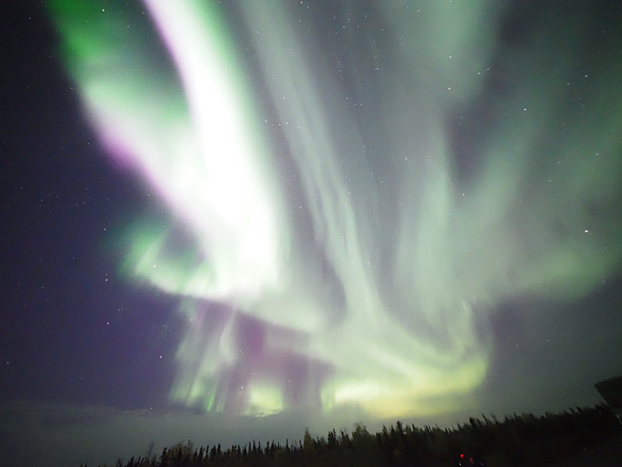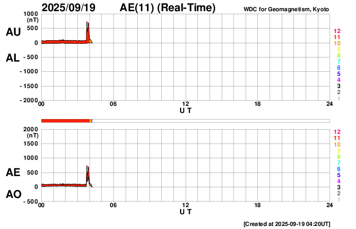 2025/ 9/19 13:28 更新 太陽風は平均的な速度に戻っています。イエローナイフのオーロラをどうぞ。 担当 篠原 カナダ・イエローナイフに滞在中の 景山植光さんよりお送りいただいたオーロラ写真の続きを紹介します。 1、2枚目は昨日の写真の数分後の撮影で、 昨日のオーロラをそのまま東の地平線へ追いかけて行って撮影した様です。 昨日から続くオーロラの複雑な動きが印象的です。 3枚目は30分ほど後の撮影です。 高い空から降り注ぐような赤いオーロラの帯がとてもきれいです。 昨日のAE指数のグラフを見ると、 400nTくらいの変化が3時間程続いています。 素晴らしい夜だっただろうと思います。 とてもきれいな写真をどうもありがとうございます。 太陽風は、昨日のニュースの後も速度の低下が続き、 今日未明には500km/秒台を割り、 現在は430km/秒と平均的な速度に戻っています。 磁場強度は3nTとやや弱い状態です。 27日周期の図を見ると、今回の高速太陽風は4日ほど続きました。 27日前の前周期の変化と比較すると、 到来が半日ほど早まって、継続時間は同じくらいになっています。 次の回帰はどうなるでしょうか。 太陽風磁場の南北成分は、 グラフの前半は南向きに変化していて、 AE指数では500nTの中規模の変化が発生しています。 その後は北寄りに変わり、磁気圏は穏やかになっています。 GOES衛星SUVI 195では、 北半球のコロナホールが太陽の中心線に達しています。 3日後の22日くらいから太陽風の速度が高まる可能性があります。 太陽は穏やかな状態が続いています。 南西(右下)の4220黒点群でC3.6、 南東(左下)の4223群でC2.9の小規模フレアが発生した程度です。