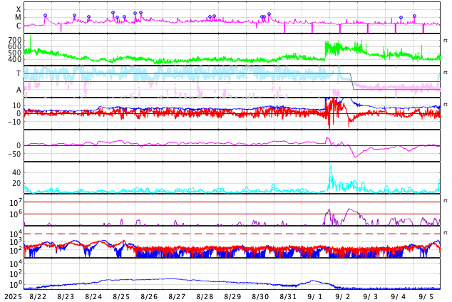 GOES衛星の太陽X線強度。赤・橙 = 0.1〜0.8 nm、青・紫 = 0.05〜0.4 nm (c) データ:NOAA/SWPC、作図:宇宙天気ニュース ![]() | |||||||||||||||||||||||||||||||||||||||||||||||||||||||||||||||||||||||||||||||||||||||||||||||||||||||||||||||||||||||||||||||||||||||||||||||||||||||||||||||||||||||||||||||||||||||||||||||||||||||||||||||||||||||||||||||||||||||||||||||||||||||||||