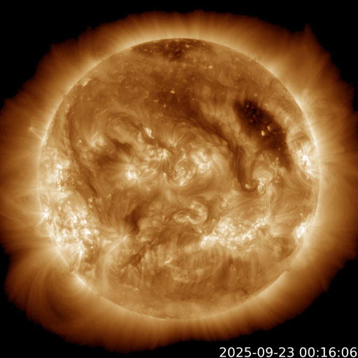 2025/ 9/23 10:02 更新 高速太陽風が到来して、速度は520km/秒に高まっています。 担当 篠原 太陽風は、330km/秒と低速の状態からゆっくりと高まり、 23日3時(世界時22日18時)頃に520km/秒と高速の風になり、 以降、この状態が続いています。 コロナホールの影響が始まった様です。 太陽風の磁場強度は、10nTから18nTへ強まり、 その後下がって、現在は10nTに戻っています。 強まった状態は続いています。 太陽風磁場の南北成分は、北寄りになっています。 このため、磁気圏の活動はあまり強まっておらず、 AE指数は、速度が高まった後に時々500nTの変化が発生する程度です。 GOES衛星SUVI 195では、 コロナホールは北西側(右上)に更に進んでいます。 横の広がりがあまり大きくないので、 高速太陽風は比較的短い期間で終わりそうです。 どのくらい続くか注目して下さい。 昨日のニュースで紹介した、 太陽の右下へ広がるCME(コロナ質量放出)の続きの動画を掲載します。 C2(赤色)に続いて、C3(青色)でもきれいに広がっています。 太陽の可視光写真では、黒点が多く見えています。 フレアは、南東の端(左下)の領域でC4.2の小規模フレア、 その隣の4227群でC3.8の小規模フレアが発生しています。