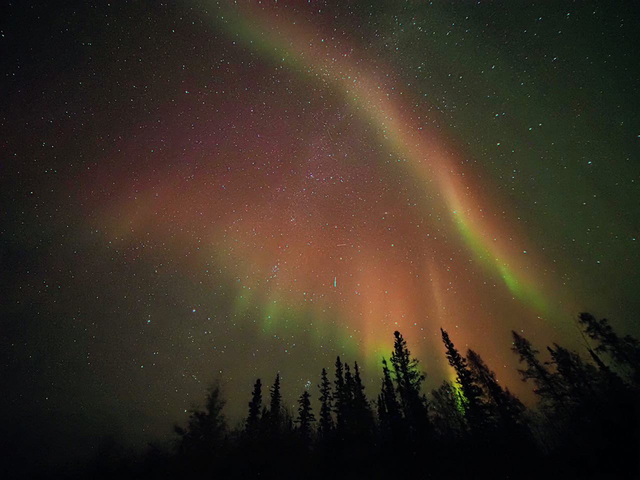 2025/ 9/24 13:04 更新 太陽風は高速の状態が続いています。イエローナイフの21日夜のオーロラをどうぞ。 担当 篠原 景山植光さんより、21日夜にカナダ・イエローナイフで撮影された オーロラの写真をいただきました。 現在の高速太陽風が始まる直前の頃で、 太陽風の速度は330km/秒と低速でしたが、 磁場強度は10nTに強まっていました。 この頃に発生した小規模の活動で、 AE指数では目立った変化は発生していませんでした。 イエローナイフでは見事なオーロラが発生していた様です。 赤と緑の色の組み合わせがとてもきれいです。 2枚目の写真では、右側に夏の大三角や夏の天の川が見えています。 実際の空での広がりが想像できます。 続きの写真を明日、明後日に掲載する予定です。 現在の太陽風は、550km/秒と高速の状態が続いています。 磁場強度は、10nTからゆっくり下がって、 5nTと平均的な値に戻っています。 コロナホールの影響が続いている様です。 磁場の南北成分は、比較的北寄りですが、 南向きにも変化していて、磁気圏の活動はある程度強まっています。 AE指数は、500〜800nTの中規模の変化が度々発生しています。 GOES衛星SUVI 195では、 コロナホールは北西の端(右上)に近付いています。 この後、太陽風の速度は低下に向かいそうです。 太陽は、南西(右下)の4217黒点群でM1.0の中規模フレア、 隣の4224群でC6.8の小規模フレア、 南東(左下)の4226群でC5.5の小規模フレアが発生しています。 特に活動的という印象はありません。
