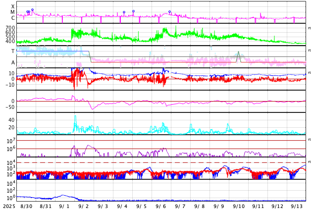 GOES衛星の太陽X線強度。赤・橙 = 0.1〜0.8 nm、青・紫 = 0.05〜0.4 nm (c) データ:NOAA/SWPC、作図:宇宙天気ニュース ![]() | ||||||||||||||||||||||||||||||||||||||||||||||||||||||||||||||||||||||||||||||||||||||||||||||||||||||||||||||||||||||||||||||||||||||||||||||||||||||||||||||||||||||||||||||||||||||||||||||||||||||||||||||||||||||||||||||||||||||||||||||||||||||||||||||||||||||||||||||||||||||||||||||||||||||||||||||||||||||||||||||||||||