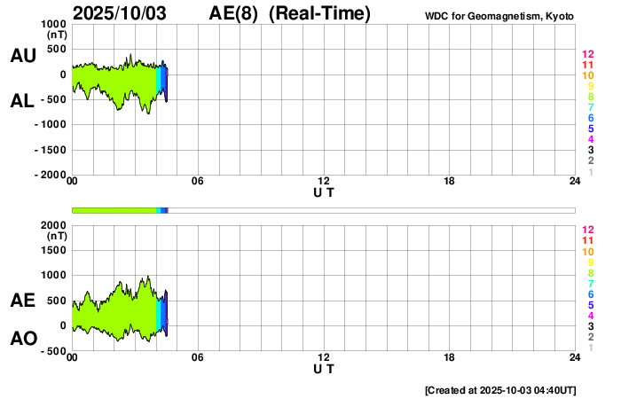 (c) GOES衛星SUVI 195 (NOAA) ![]() SDO衛星による太陽の可視光写真。SOHO衛星のWebページより取得しました。 (c) SDO (NASA) ![]() ACEが観測した太陽風の磁場(黒線は全体の強度、赤線は南北成分) 磁場の向き、プラズマの密度、速度、温度 (c) データ:NOAA/SWPC、作図:宇宙天気ニュース ![]() AE指数(速報値) 下段のAEグラフの値が高くなると、オーロラ活動が活発化しています。 (c) 京都大学WDC ![]() ![]() 27日の太陽周期に合わせた図 太陽が同じ面を地球に向けていた27日前の変化から、今後を予想することができます。 (c) 作図:宇宙天気ニュース