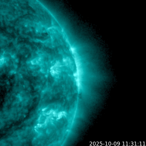 2025/10/10 14:45 更新 太陽風の速度は300km/秒とより低速になっています。 担当 篠原 太陽風の速度は、 グラフの初めに340km/秒から400km/秒に急に上がる変化が発生しています。 その後は低下が続き、現在は300km/秒に下がっています。 低速の状態です。 磁場強度も8nTから14nTに急に強まりましたが、 その後は低下して、現在は8nTに戻っています。 磁場の南北成分は、太陽風の強まりの時に北向きに大きく変化し、 その後南向きに切り替わって、 以降、-3〜 -5nT程度の南向きの状態が続いています。 速度が下がっているため影響は限定的ですが、 AE指数は、後半で400nTの小規模の変化が発生しています。 GOES衛星SUVI 195の太陽コロナ写真では、 コロナホールが西側(右側)に進んでいます。 明日くらいから太陽風の速度が高まる可能性があります。 27日周期の図を見ると、前周期は9月15日から速度が高まっていて、 これは、明後日、10月12日に相当します。 どのタイミングで変化が始まるでしょうか。 太陽は、昨夜、9日21時(世界時9日12時)に、 北西の端(右上)で、M2.0の中規模フレアが発生しました。 GOES衛星SUVI 131の動画を掲載します。 動画ではコロナの噴出が見えていますが、 CME(コロナ質量放出)は小規模でした。 その他は目立った変化は発生していません。