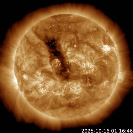 2025/10/16 11:58 更新 4246黒点群で、Mクラスフレアの発生が続いています。高速太陽風は終わりました。 担当 篠原 太陽の北西側(右上)の4246黒点群では、 活発なフレアの発生が続いています。 昨日のニュース以降では、 M3.7、M1.1、M2.7、M2.4、M1.1と 中規模フレアが5回発生しています。 15日23時(世界時14日14時)に発生したM1.1、 16日7時(世界時14日22時)のM2.7と、 その後のM2.4、M1.1のフレアの様子を、 GOES衛星SUVI 131の動画で紹介します。 これらのフレアでは、CME(コロナ質量放出)も発生していて、 SOHO衛星LASCO C2、C3では、 太陽の右上へ広がる様子が観測されています。 横向きに近い噴出なので、地球への影響はないでしょう。 4266群は、この後太陽の端に近付きます。 見えている間にどの様な活動を起こすでしょうか。 太陽風は、昨日の午後から速度はゆっくりと低下して、 550km/秒から460km/秒へ下がっています。 高速の状態は終わり、平均的な速度に戻っています。 磁場強度は、4nTから2nTへ下がり、 その後4nTに戻っています。 磁気圏は穏やかになっていて、 AE指数は、グラフの途中から変化が見られなくなっています。 GOES衛星SUVI 195では、 コロナホールが太陽の中心線に達しています。 3日後くらいから太陽風の速度が高まる可能性があります。 27日周期の図を見ると、 前周期は9月22日から速度が高まっていて、 これは、今回は10月19日に相当します。 ![]() 4246黒点群で発生した、M1.1の中規模フレア。 (c) GOES衛星SUVI 131 (NOAA)、(動画加工 : 宇宙天気ニュース) ![]() 4246黒点群で発生した、M2.7、M2.4、M1.1の中規模フレア。 (c) GOES衛星SUVI 131 (NOAA)、(動画加工 : 宇宙天気ニュース) ![]() 太陽の右上へ広がるCME。2つのフレアの動画に対応して、CMEが2回飛び出しています。 (c) SOHO衛星LASCO C2、C3 (ESA & NASA)、(動画加工 : 宇宙天気ニュース) ![]() GOES衛星SUVI 195カメラによる太陽コロナの様子 (c) GOES衛星SUVI 195 (NOAA) ![]() SDO衛星による太陽の可視光写真。SOHO衛星のWebページより取得しました。 (c) SDO (NASA) ![]() GOES衛星の太陽X線強度。赤・橙 = 0.1〜0.8 nm、青・紫 = 0.05〜0.4 nm (c) データ:NOAA/SWPC、作図:宇宙天気ニュース ![]() ACEが観測した太陽風の磁場(黒線は全体の強度、赤線は南北成分) 磁場の向き、プラズマの密度、速度、温度 (c) データ:NOAA/SWPC、作図:宇宙天気ニュース ![]() AE指数(速報値) 下段のAEグラフの値が高くなると、オーロラ活動が活発化しています。 (c) 京都大学WDC ![]() ![]() 27日の太陽周期に合わせた図 太陽が同じ面を地球に向けていた27日前の変化から、今後を予想することができます。 (c) 作図:宇宙天気ニュース