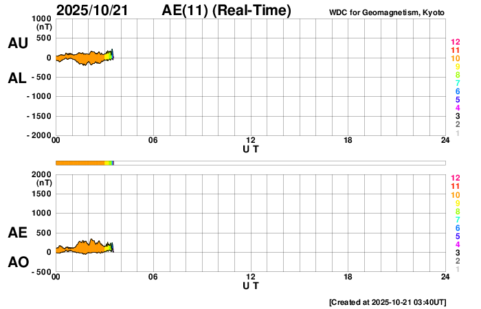 2025/10/21 12:52 更新 500km/秒台の高速太陽風が続いています。磁気圏は比較的穏やかです。 担当 篠原 太陽風は、500〜550km/秒の間で高速の状態が続いています。 磁場強度は、5〜6nTと平均的な状態です。 27日周期の図を見ると、 高速の太陽風は始まって3日が過ぎようとしています。 前周期は4日ほどで終わったのですが、 今回はもう少し続くかもしれません。 磁場の南北成分は、比較的北寄りで推移しています。 磁気圏は比較的穏やかな状態で、 AE指数は、小規模の変化が時々発生する程度です。 GOES衛星SUVI 195では、 コロナホールは北西の端(右上)に近付いています。 高速の風がどこまで続くか注目して下さい。 太陽は、北西の端(右上)の向こう側に進んだ 4246黒点群や4248群などで活動が続いている様で、 SOHO衛星LASCO C2、C3を見ると、 CME(コロナ質量放出)が太陽の右上に次々に飛び出しています。 およそ1日分の動画を掲載します。 太陽のこちら側は穏やかになっていて、 X線グラフは変化が少なくなっています。 ![]() 太陽の右上へ次々に飛び出すCME。太陽の向こう側で発生した噴出です。 (c) SOHO衛星LASCO C2、C3 (ESA & NASA)、(動画加工 : 宇宙天気ニュース) ![]() GOES衛星SUVI 195カメラによる太陽コロナの様子 (c) GOES衛星SUVI 195 (NOAA) ![]() SDO衛星による太陽の可視光写真。SOHO衛星のWebページより取得しました。 (c) SDO (NASA) ![]() ACEが観測した太陽風の磁場(黒線は全体の強度、赤線は南北成分) 磁場の向き、プラズマの密度、速度、温度 (c) データ:NOAA/SWPC、作図:宇宙天気ニュース ![]() AE指数(速報値) 下段のAEグラフの値が高くなると、オーロラ活動が活発化しています。 (c) 京都大学WDC ![]() ![]() 27日の太陽周期に合わせた図 太陽が同じ面を地球に向けていた27日前の変化から、今後を予想することができます。 (c) 作図:宇宙天気ニュース