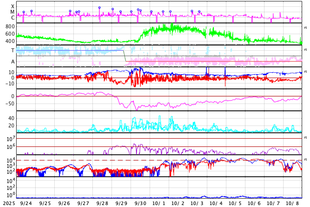 GOES衛星の太陽X線強度。赤・橙 = 0.1〜0.8 nm、青・紫 = 0.05〜0.4 nm (c) データ:NOAA/SWPC、作図:宇宙天気ニュース  | |||||||||||||||||||||||||||||||||||||||||||||||||||||||||||||||||||||||||||||||||||||||||||||||||||||||||||||||||||||||||||||||||||||||||||||||||||||||||||||||||||||||||||||||||||||||||||||||||||||||||||||||||||||||||||||||||||||||