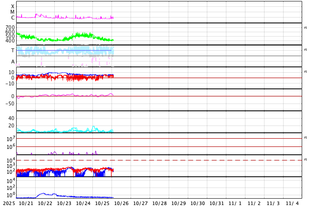 2025/10/26 11:50 更新 太陽風の速度は下がり、平均的な状態に戻っています。 担当 篠原 太陽風の速度は、昨日のニュースの後に500km/秒台を割り、 次第に低下して、400km/秒と平均的な速度に戻っています。 磁場強度は、5〜6nTと平均的な値で安定しています。 太陽風速度の高まりは、1日半ほどで終わりました。 太陽風磁場の南北成分は、 グラフの初めに南向きの変化がありますが、 以降は北寄りで推移しています。 磁気圏は穏やかで、AE指数は変化が見られなくなっています。 GOES衛星SUVI 195の太陽コロナ写真を見ると、 太陽の南東側(左下)に、 コロナホールが横方向に広がっています。 先頭(右端)が太陽の中心線に達しているので、 3日後くらいから影響が始まりそうです。 一方、27日周期の図を見ると、 前周期の太陽風は9月10日から速度が高まっています。 このタイミングで高速風が回帰すると、 明後日、28日に速度が高まるかもしれません。 到来のタイミングも含めて、太陽風の変化に注目して下さい。 太陽は、東側(左側)の4267黒点群で C2.2の小規模フレアが発生した程度で、 こちら側は穏やかです。 向こう側では活動が続いているようで、 昨夜、25日20時(世界時25日11時)に、 太陽の北側(上側)に広がるCME(コロナ質量放出)が発生しています。 SOHO衛星LASCO C2、C3と、 太陽を地球よりも右斜めから観測している STEREO Ahead衛星COR2の動画を掲載します。 2つの動画を見比べると、 CMEの噴出が立体的にイメージできるかもしれません。 動画では、同じ頃に太陽の南側(下側)に広がるCMEも写っています。  太陽の上側と下側に広がるCME。 (c) SOHO衛星LASCO C2、C3 (ESA & NASA)、(動画加工 : 宇宙天気ニュース)  太陽を地球よりも右斜めから観測しているSTEREO Ahead衛星によるCME。 (c) STEREO Ahead衛星COR2 (NASA)、(動画加工 : 宇宙天気ニュース)  GOES衛星SUVI 195カメラによる太陽コロナの様子 (c) GOES衛星SUVI 195 (NOAA)  SDO衛星による太陽の可視光写真。SOHO衛星のWebページより取得しました。 (c) SDO (NASA)  ACEが観測した太陽風の磁場(黒線は全体の強度、赤線は南北成分) 磁場の向き、プラズマの密度、速度、温度 (c) データ:NOAA/SWPC、作図:宇宙天気ニュース  AE指数(速報値) 下段のAEグラフの値が高くなると、オーロラ活動が活発化しています。 (c) 京都大学WDC   27日の太陽周期に合わせた図 太陽が同じ面を地球に向けていた27日前の変化から、今後を予想することができます。 (c) 作図:宇宙天気ニュース