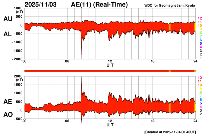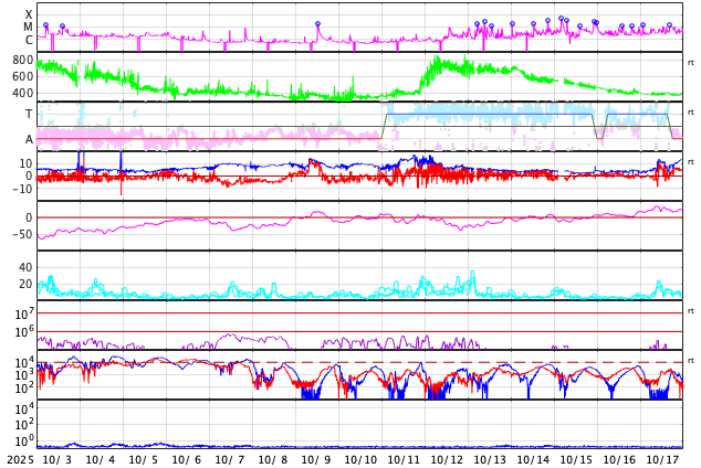 (c) GOES衛星SUVI 131 (NOAA)、(動画加工 : 宇宙天気ニュース) ![]() CMEが太陽の左側に広がっています。淡いですがCMEは右側にも広がっている様です。 (c) GOES衛星CCOR-1 (NOAA)、(動画加工 : 宇宙天気ニュース) ![]() 太陽の左側に広がるCME。 (c) SOHO衛星LASCO C2、C3 (ESA & NASA)、(動画加工 : 宇宙天気ニュース) ![]() 太陽風の乱れは、地球に対して横向きに飛び出しています。 (c) WSA-ENLIL太陽風予報 (NOAA)、(動画加工 : 宇宙天気ニュース) ![]() GOES衛星のSUVI 195カメラによる太陽コロナの様子 (c) NOAA/SWPC ![]() SDO衛星による太陽の可視光写真(SOHO衛星の画像ページより取得)。 マウスの矢印を写真に重ねると、黒点番号付きの写真に切り替わります。 (c) SDO (NASA) ![]() GOES衛星の太陽X線強度。赤・橙 = 0.1〜0.8 nm、青・紫 = 0.05〜0.4 nm (c) データ:NOAA/SWPC、作図:宇宙天気ニュース ![]() ACEが観測した太陽風の磁場(黒線は全体の強度、赤線は南北成分) 磁場の向き、プラズマの密度、速度、温度 (c) データ:NOAA/SWPC、作図:宇宙天気ニュース ![]() AE指数(速報値) 下段のAEグラフの値が高くなると、オーロラ活動が活発化しています。 (c) 京都大学WDC ![]() ![]() 27日の太陽周期に合わせた図 太陽が同じ面を地球に向けていた27日前の変化から、今後を予想することができます。 (c) 作図:宇宙天気ニュース