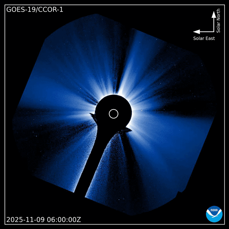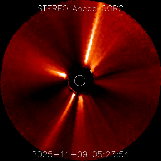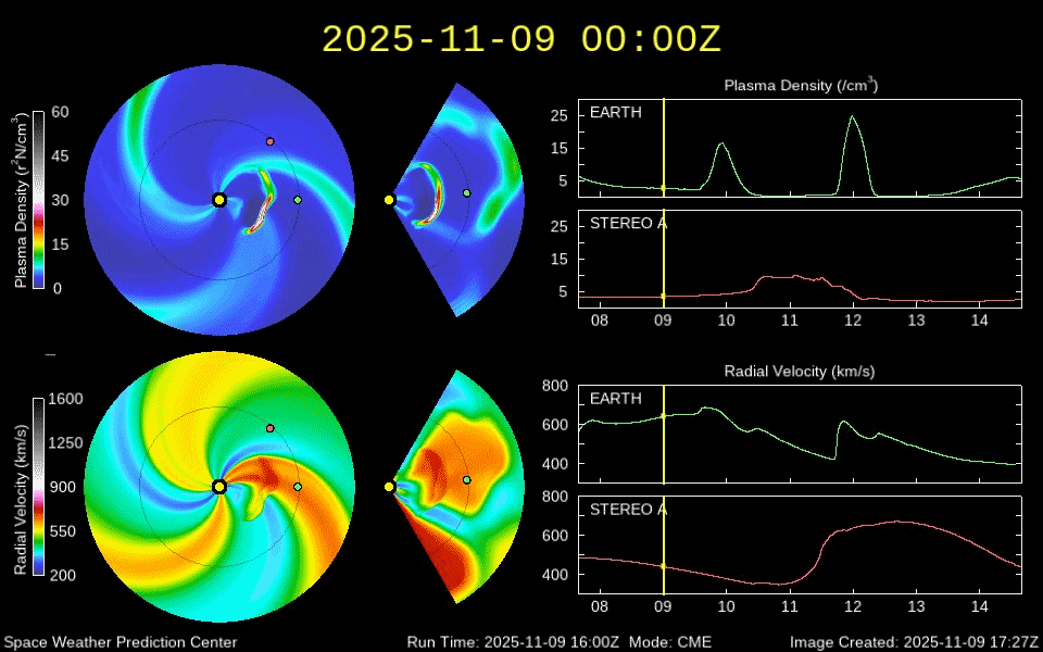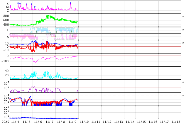 2025/11/10 07:48 更新 X1.7の大規模フレアが発生しました。CMEによる太陽風の乱れが地球に向かっています。 担当 篠原 昨夕、9日16時(世界時9日7時)に、太陽の中心部北側の4274黒点群で、 X1.7の大規模フレアが発生しました。 4274群のXフレアは、世界時4日に発生したX1.8以来です。 GOES衛星SUVI 131の動画を掲載します。 このフレアに伴って、CME(コロナ質量放出)が発生しています。 SOHO衛星LASCO C2、C3と GOES衛星CCOR-1の動画を掲載します。 太陽の右上側に少し濃く広がっている様ですが、 太陽を丸く囲むように広がるハロー型のCMEになっています。 また、太陽を地球よりも右斜めから観測している STEREO Ahead衛星COR2では、 CMEは地球のある左側に飛び出しています。 NOAA/SWPCの太陽風予報によると、 このCMEによる太陽風の乱れは、 明後日の未明、12日3時(世界時11日18時)頃に 地球に到来する可能性があるとのことです。 この場合、フレアの発生から地球まで2日半ほどかかることになります。 速度の高まりはそれほど大きくはなさそうです。 しかし、オーロラなど磁気圏活動の強まりは、 太陽風磁場の南向きの変化が大きく影響します。 どの様な乱れがやって来るのか注目して下さい。 太陽は、その後は目立った活動は発生していません。 太陽風は、速度が600km/秒から500km/秒近くまで下がり、 最後は550km/秒に少し上がっています。 高速の状態は続いています。 磁場強度は、4nTから6nTに少し上がっていますが、 平均的な状態です。 太陽風磁場の南北成分は、北寄りの傾向が続いています。 グラフの最後で、-5nTの南向きの変化が発生していますが、 この後はどちら寄りで推移するでしょうか。 磁気圏は穏やかで、AE指数はほとんど変化がありません。 GOES衛星SUVI 195では、 北西(右上)のコロナホールはほとんど見えなくなり、 このコロナホールによる高速太陽風は、そろそろ終わりそうです。 続いて到来するCMEによる乱れに注目して下さい。 ![]() 4274黒点群で発生した、X1.7の大規模フレア。 (c) GOES衛星SUVI 131 (NOAA)、(動画加工 : 宇宙天気ニュース) ![]() 太陽を丸く囲むように広がるハロー型のCMEが発生しています。 (c) SOHO衛星LASCO C2、C3 (ESA & NASA)、(動画加工 : 宇宙天気ニュース) ![]() 太陽の右上側に少し濃く飛び出している様です。 (c) GOES衛星CCOR-1 (NOAA)、(動画加工 : 宇宙天気ニュース) ![]() 太陽を地球よりも右斜めから観測しているSTEREO Ahead衛星では、CMEは地球のある左側に広がっています。 (c) STEREO Ahead衛星COR2 (NASA)、(動画加工 : 宇宙天気ニュース) ![]() 太陽風の乱れは、12日3時(世界時11日18時)頃に地球に到来する可能性があります。 (c) WSA-ENLIL太陽風予報 (NOAA)、(動画加工 : 宇宙天気ニュース) ![]() GOES衛星のSUVI 195カメラによる太陽コロナの様子 (c) NOAA/SWPC ![]() SDO衛星による太陽の可視光写真(SOHO衛星の画像ページより取得)。 マウスの矢印を写真に重ねると、黒点番号付きの写真に切り替わります。 (c) SDO (NASA) ![]() GOES衛星の太陽X線強度。赤・橙 = 0.1〜0.8 nm、青・紫 = 0.05〜0.4 nm (c) データ:NOAA/SWPC、作図:宇宙天気ニュース ![]() ACEが観測した太陽風の磁場(黒線は全体の強度、赤線は南北成分) 磁場の向き、プラズマの密度、速度、温度 (c) データ:NOAA/SWPC、作図:宇宙天気ニュース ![]() AE指数(速報値) 下段のAEグラフの値が高くなると、オーロラ活動が活発化しています。 (c) 京都大学WDC ![]() 27日の太陽周期に合わせた図 太陽が同じ面を地球に向けていた27日前の変化から、今後を予想することができます。 (c) 作図:宇宙天気ニュース