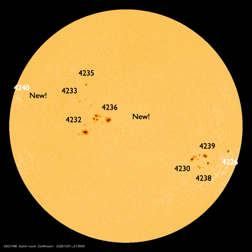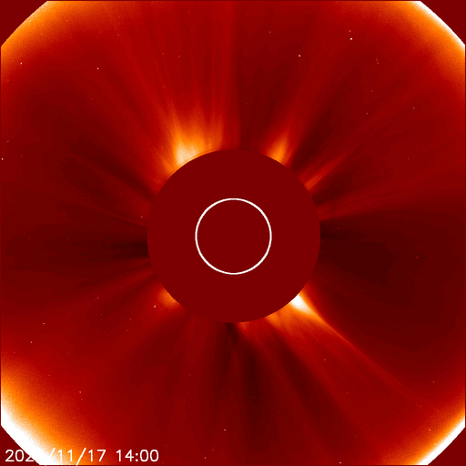 (c) 黒点データ:WDC-SILSO、作図:宇宙天気ニュース ![]() 10月の太陽黒点の推移。 (c) SDO衛星HMII (NASA)、(動画加工 : 宇宙天気ニュース) ![]() 1975年以降の太陽黒点相対数の長期変化。 (c) 黒点データ:WDC-SILSO、作図:宇宙天気ニュース ![]() 太陽の北西の端の向こう側で発生したCME。 (c) SOHO衛星LASCO C2、C3 (ESA & NASA)、(動画加工 : 宇宙天気ニュース) ![]() GOES衛星のSUVI 195カメラによる太陽コロナの様子 (c) NOAA/SWPC ![]() SDO衛星による太陽の可視光写真(SOHO衛星の画像ページより取得)。 マウスの矢印を写真に重ねると、黒点番号付きの写真に切り替わります。 (c) SDO (NASA) ![]() ACEが観測した太陽風の磁場(黒線は全体の強度、赤線は南北成分) 磁場の向き、プラズマの密度、速度、温度 (c) データ:NOAA/SWPC、作図:宇宙天気ニュース ![]() AE指数(速報値) 下段のAEグラフの値が高くなると、オーロラ活動が活発化しています。 (c) 京都大学WDC ![]() ![]() 27日の太陽周期に合わせた図 太陽が同じ面を地球に向けていた27日前の変化から、今後を予想することができます。 (c) 作図:宇宙天気ニュース