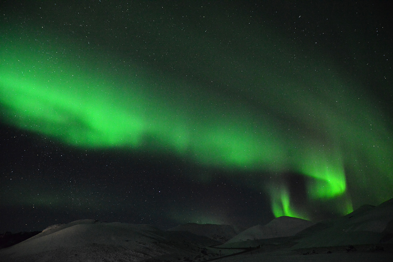 2025/12/18 12:13 更新 太陽風は650km/秒と高速です。アイスランドのオーロラをどうぞ。 担当 篠原 アイスランドに滞在中の藤井哲也さんと高家幹夫さんより、 現地17日未明に撮影されたオーロラの写真をいただきました。 撮影場所は、アイスランド北部にあるミーバトン湖とのことです。 撮影の頃は、太陽風の速度は600km/秒と高まっていたのですが、 磁場の南向きの変化が少なく、AE指数はほとんど変化のない穏やかな状況でした。 藤井さんによると、 オーロラは強くなったり弱くなったりを繰り返していたとのことで、 強い活動にはなっていなかった様です。 1枚目の写真は、魚眼レンズによる全天の写真です。 東側から昇ったオーロラと西側から昇ったオーロラが、 やがてこの写真の様に、きれいに一つに繋がったとのことです。 緑色の光から赤色の光へ上がっていく様子がとてもきれいです。 左上の低空にオリオン座が見えています。 さすが高緯度地域です。 その後、つながったオーロラが動き始めて、太くなり(2枚目)、 強くなったり弱くなったりを繰り返していたそうです(3枚目)。 現地は快晴で、気温はマイナス13度まで下がっていたそうです。 きれいなオーロラの姿をありがとうございます。 太陽風の速度は、600km/秒から650km/秒へ再び高まっています。 SDO衛星AIA195を見ると、南北に縦に伸びるコロナホールは、 西側(右側)にだいぶ進んでいて、この領域の影響がやって来ているようです。 太陽風の磁場強度は、5nT前後と平均的な状態です。 磁場の南北成分は、南北に変化していて、 -5nT程度の南向きの変化も発生しています。 このため、磁気圏の活動は強まっていて、 AE指数は、途中から500nT程度の変化が発生するようになり、 後半では800nTと中規模の変化に達しています。 今回の太陽風速度の高まりに関係していると思われる 太陽の西側のコロナホールは、 縦に伸びていて横方向の広がりは小さいです。 このため、太陽風の高速の状態はあまり長く続かない様に思います。 この後の速度の変化に注目してください。 また、東側(左側)に次のコロナホールが見えています。 5日後くらいから、この領域の影響が始まりそうです。 太陽のX線強度のグラフは、変化が少なくなっています。 太陽は穏やかな状態です。 可視光写真では、北東の端(左上)に新しい黒点群が現れていますが、 特に活動は起こしていません。