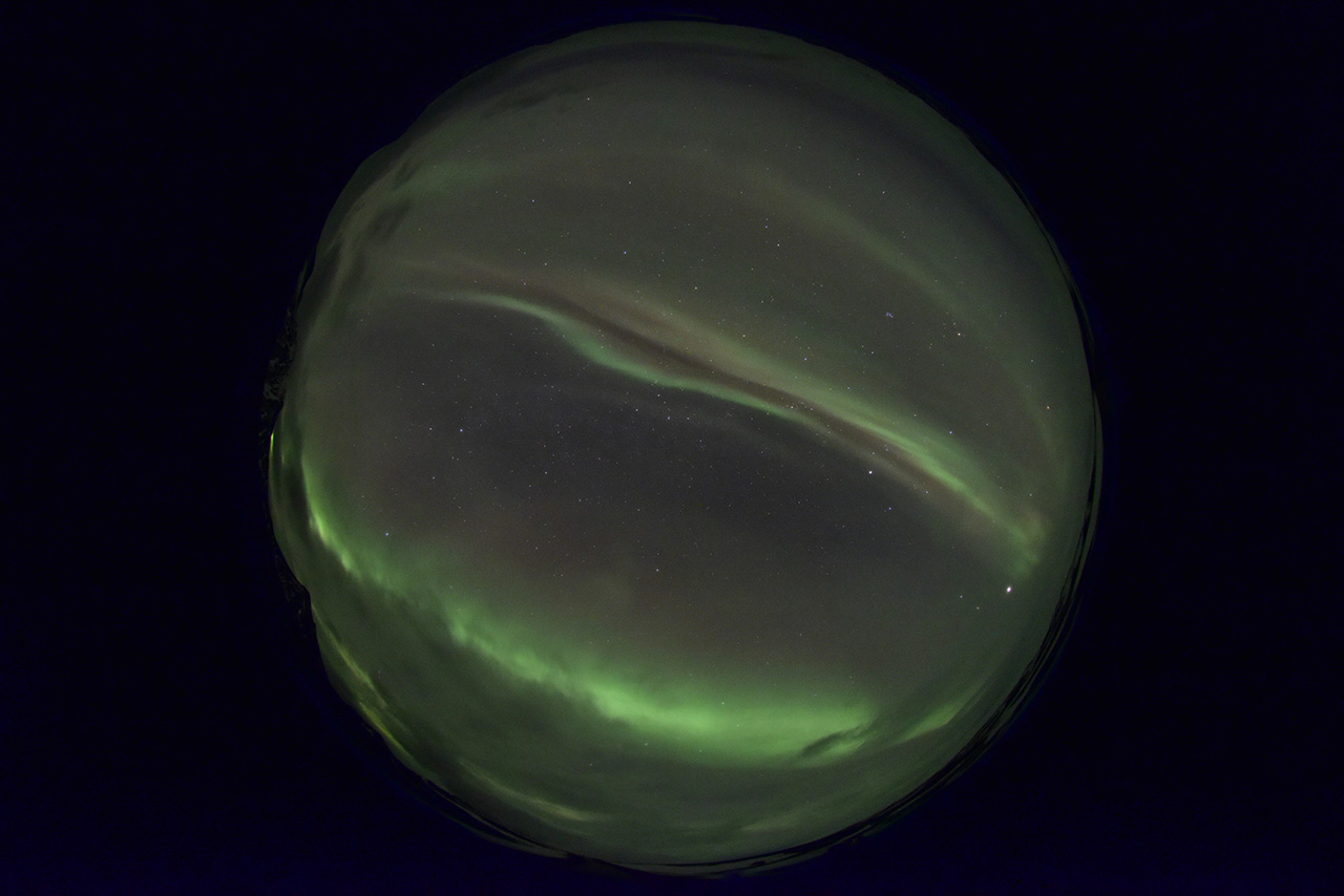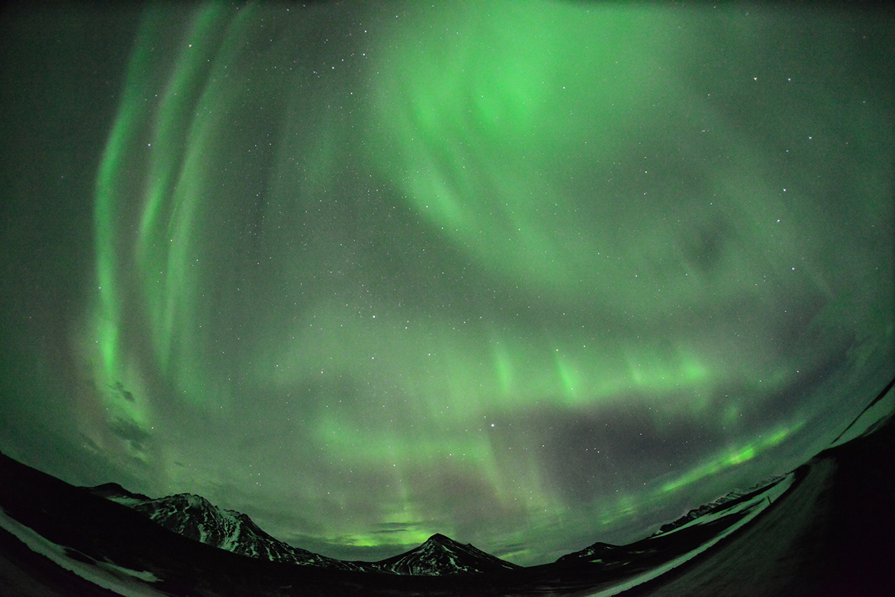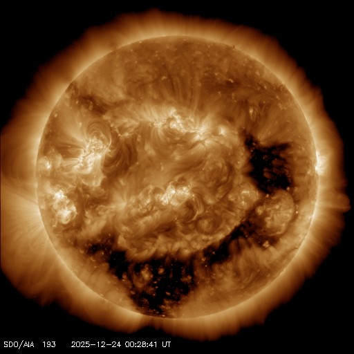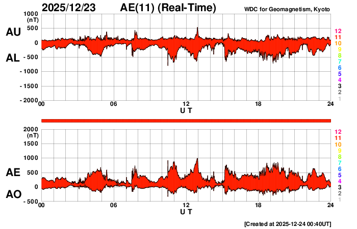 2025/12/24 09:53 更新 高速の太陽風が続き、磁気圏も活動的です。アイスランドのオーロラをどうぞ。 担当 篠原 アイスランドに滞在中の藤井哲也さんと高家幹夫さんより、 現地22日に撮影されたオーロラの写真をいただきました。 太陽風の速度は700km/秒とかなり高く、 AE指数は、22時頃まで700nT程度の中規模の変化が続いていました。 現地は、20時から21時半くらいまで晴れ間があったそうで、 ちょうど良いタイミングで観測できた様です。 光害のほとんどない場所で、月明かりもなく理想的な観測条件だったそうです。 1枚目は晴れてオーロラが見え始めた頃で、2枚目で少し強くなり、 3枚目で一気に激しい輝きが空を覆っています。 4枚目はその1分後とのことで、 短い時間にオーロラの姿が大きく変わる様子が想像できます。 5枚目は、北の空を撮影したもので、 右側に北斗七星、その左に北極星、 上側の真ん中付近にカシオペヤ座が見えています。 山に積もった雪がオーロラに照らされて、 緑色に見えているのがとてもきれいです。 この後、空は雲に覆われてしまったそうです。 最初の頃の写真と比較すると、 太陽風が強まってオーロラの活動が活発になっている様子がとてもよく分かります。 一週間にわたる観測の報告をどうもありがとうございます。 現在の太陽風は、速度が700km/秒から680km/秒へ少し下がっています。 速度がかなり高まっている状態は続いています。 磁場強度は6nT前後で、平均的な状態です。 磁場の南北成分は、弱い南寄りになっています。 磁気圏の活動は活発で、 AE指数は、500〜800nTの中規模の変化が次々に発生しています。 藤井さんの報告の様に、 極域では賑やかなオーロラが続いているのではないでしょうか。 SDO衛星AIA193の太陽コロナ写真を見ると、 高速の太陽風をもたらしているコロナホールは、 西側(右側)の赤道付近から、左下へ向かって南半球の高緯度側に広がり、 その左側では中緯度側へ上がっています。 この左側の広がりは、前周期は見られなかった領域で、 この部分からも影響がやって来ると考えると、 太陽風の強まりは、この後も1週間程度続くかもしれません。 太陽は、X線グラフに目立った変化はなく、 穏やかな状態です。 可視光写真では、黒点が増えて少し賑やかになっています。