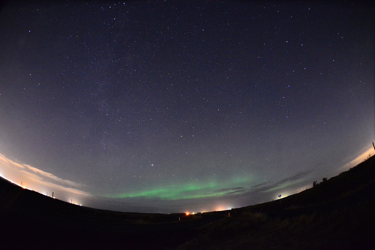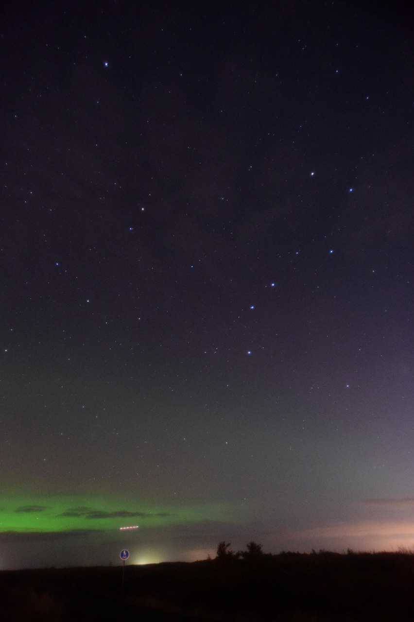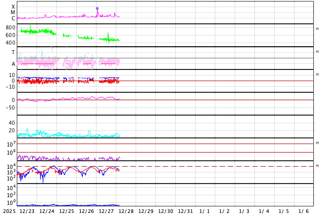 2025/12/28 13:44 更新 太陽風の速度は460km/秒に下がり、高速風は終わっています。アイスランドのオーロラをどうぞ。 担当 篠原 アイスランドに滞在中の藤井哲也さんと高家幹夫さんより、 現地26日深夜に撮影されたオーロラの写真をいただきました。 太陽風の速度は500km/秒と高速の状態が続いていたのですが、 磁場の南向きの変化が小さかった様で、 オーロラの活動はとても弱くなっていました。 AE指数を見ると(昨日のニュースに掲載しています)、 26日は18時以降ほとんど変化がなくなっています。 このため、送っていただいた写真でもオーロラの光は弱く、 北の低空に微かに見えている程度です。 活動が小さい時の現地の様子として、とても参考になります。 2枚目の写真では、右に北斗七星の大きい柄杓、 左にこぐま座の小さい柄杓が見えています。 どちらも真っ直ぐに立っている状態で、 この位置関係で空高く見えるのは、高緯度地域ならではと言えるでしょう。 鹿児島では、この状態では北斗七星の下の方はまだ地面の下です。 3枚目の写真では、 上側の真ん中に南の低空に輝くオリオン座が見えています。 右に見える明かりはレイキャビックの街、 左はケフラビーク国際空港とのことです。 今回も興味深い写真をどうもありがとうございます。 現在の太陽風は、 速度は500km/秒から460km/秒へ少し下がっている様です。 高速の状態は一旦終わっています。 磁場強度は、5〜6nTと平均的な状態です。 磁場の南北成分は、小さく南北に変化しています。 磁気圏へは弱い影響が及んでいる様で、 AE指数は基本的には穏やかですが、 時々、500nT程度の変化が発生しています。 SDO衛星AIA193では、 南半球のコロナホールは南西側(右下)に進んでいます。 今の所、影響は弱まっていますが、この後はどう推移するでしょうか。 一方、北半球のコロナホールは、 先頭(右端)が太陽の中心線に達しています。 3日後くらいからこの領域の影響が始まりそうです。 この領域の影響は前の周期にも到来していて、 27日周期の図を見ると、12月4日から速度が高まっています。 今回は、12月31日頃でしょうか。 年末から新年にかけてオーロラの活動が強まるかもしれません。 太陽は、北西(右上)の4317黒点群で、 C9.8とMクラス寸前の小規模フレアが発生しました。