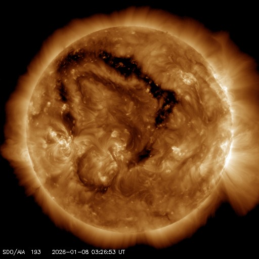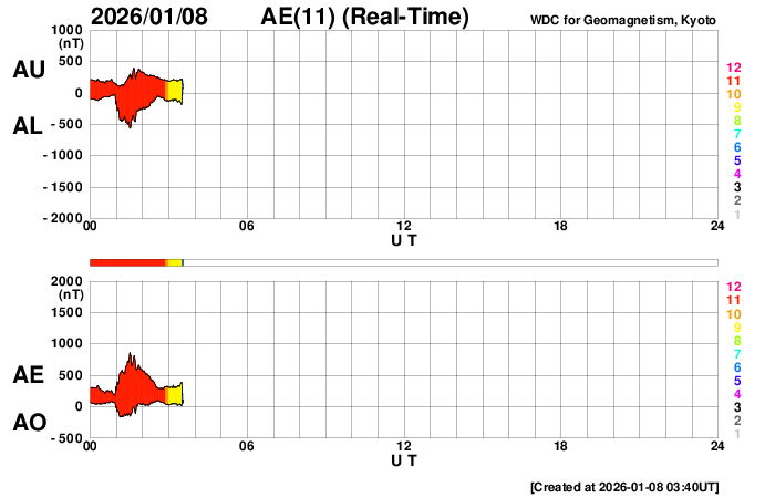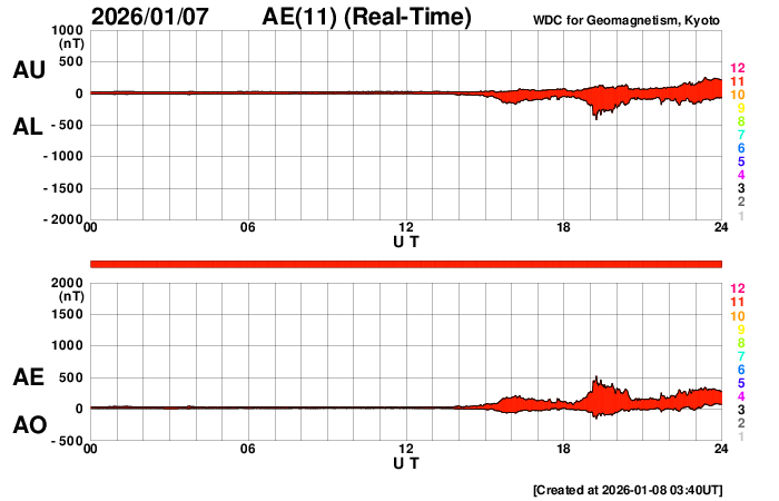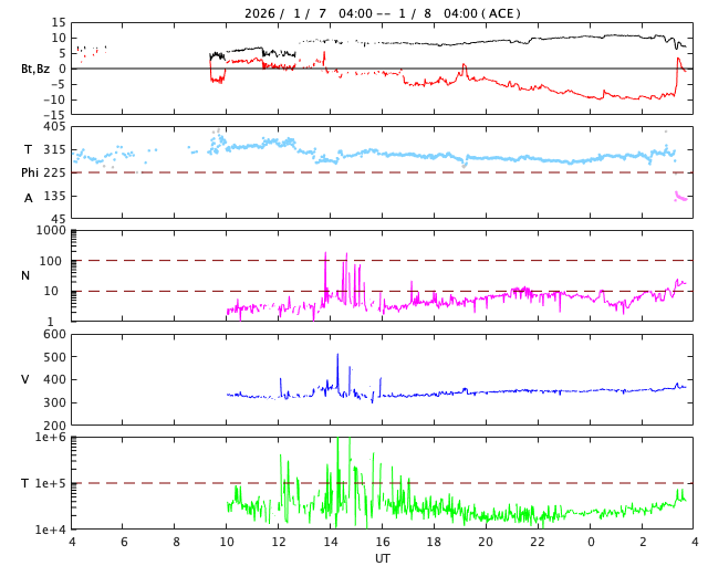 2026/ 1/ 8 12:55 更新 太陽風は低速ですが、磁場が南向きに変化して磁気圏の活動が少し強まっています。 担当 篠原 昨日紹介したSOHO衛星LASCO C2での金星と火星の接近ですが、 現在の画像ではもうすぐ最接近になりそうです。 この1日間の動画を掲載します。 現在、この画像の反対側(地球から見て太陽と反対の方向)には、 木星が位置しています(明後日、10日が衝です)。 すると、火星、金星、太陽、地球、木星の順番で、 5つの天体が真っ直ぐ並んでいることになります。 これに関連して、space weather.comの1月7日のページで、 この惑星の並びと太陽活動との興味深い話題が紹介されています。 (英語のページですが、翻訳サービスを使用するなどしてご覧下さい) 太陽風は、速度は330km/秒から360km/秒へ少し上がっている様ですが、 低速の状態が続いています。 磁場強度は、5nTからゆっくりと上昇して、 現在は10nTに強まっています。 磁場の南北成分は、今日に入った頃から南向きに切り替わり、 グラフの後半では、-10nT近くまで南向きに強まっています。 このため、磁気圏の活動もある程度強まっていて、 AE指数は、途中から小規模の変化が続く様になり、 800nTに達する中規模の変化も発生しています。 太陽風のグラフの最後では、磁場は北向きに急に変化しています。 この後はどの様に変化するでしょうか。 SDO衛星AIA193では、 北半球のコロナホールは、西側(右側)に次第に進んでいます。 明日くらいから太陽風の速度が高まりそうです。 27日周期の図を見ると、 前周期は、12月13〜14日に速度が高まって、一旦下がり、 16日から再び高速太陽風が始まっています。 コロナホールの広がりは、前周期と似た形になっていますが、 太陽風の変化は今回はどうなるでしょうか。 太陽は、中心部南側(下側)の4334黒点群で C7.4と大きめの小規模フレアが発生しています。 その他に、C1〜3の小さい小規模フレアが、 4334群、4337群、4325群などで発生しています。