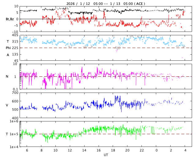 2026/ 1/13 13:17 更新 太陽は穏やかです。太陽風の速度は580km/秒に高まっています。 担当 篠原 昨日のニュースで紹介したM3.3の中規模フレアでは、 フレアの後にポストフレアループが綺麗に見えていました。 SDO衛星AIA171の動画で紹介します。 その後の太陽は、中心部南西側(右下)の4336黒点群で C5.2の中規模フレアが発生しています。 しかし、その他は目立った活動はなく、 M3.3フレアが発生した南東の端(左下)も特に変化はありません。 太陽風は、速度が520km/秒から580km/秒へ一段高まっています。 磁場強度は、7nT付近で安定しています。 磁場の南北成分は、 南寄りから0nT付近に変わり、再び南寄りに傾向が変化しています。 磁気圏の活動も対応していて、AE指数を見ると、 初めに500nTを超えるくらいの中規模の活動が発生して、 穏やかな状態がしばらく続き、 後半で再び500nTくらいの中規模の変化が発生しています。 太陽風のグラフの最後では、磁場は北向きに変化しています。 この後はどちら寄りで推移するでしょうか。 SDO衛星AIA193では、 北半球のコロナホールは、北西側(右上)に進んでいます。 太陽風の速度の高まりは、もうしばらく続きそうです。 そして、南東の端に新しいコロナホールが姿を表しています。 この領域は27日前にもあって、 27日周期の図では12月21日から太陽風の速度が高まっています。 この場合、今回は1月17日から速度が高まるかもしれません。 注目して下さい。