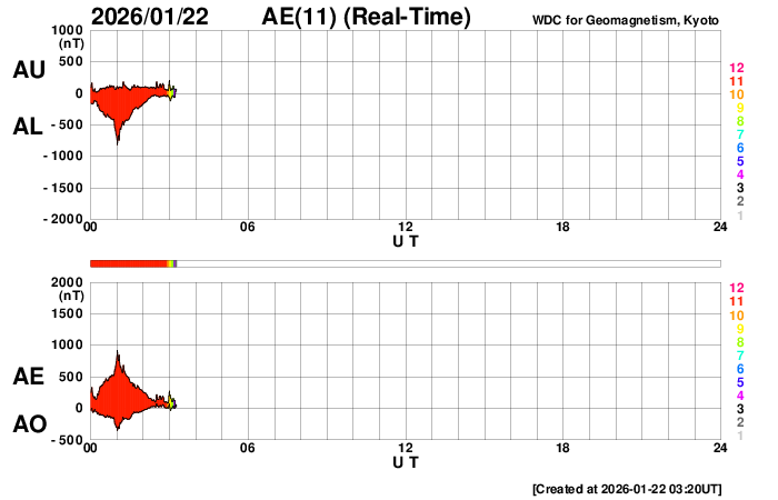 2026/ 1/22 12:39 更新 太陽風は550km/秒と高速の風が続いています。ニュージーランドのオーロラをどうぞ。 担当 篠原 ニュージーランドの米戸 実さんより、 現地20日〜21日夜の素晴らしいオーロラ写真をいただきました。 この夜は天気が悪くなるという状況だったので、 雲から離れるため、南島の南の端近くまで 200kmくらい移動しての撮影だったとのことです。 目的地に近づいた所で空いっぱいに雲が見えたので、だめかと思ったところ、 それはオーロラだったとのことです。 撮影地に到着してすぐに撮ったのが1枚めで、 現地は天文薄明が終わる1時間前だったそうです。 それにも関わらず、これだけのオーロラの光が見えていて、 過去一番の驚きだったそうです。 データを見ると、太陽風の速度は900km/秒台、 磁場が南向きに切り替わって4時間ほど経った頃で、 AE指数はこの前後の時間帯で 2000nTの枠を飛び出すような激しい変化が発生していました。 2枚めは空一杯に光が広がっています。 ちょうど、AE指数のグラフが大きく飛び出している頃の撮影です。 3枚めは磁場の南向きが小さくなって、AE指数の変化が少し下がった頃ですが、 オーロラの縦の構造がきれいに見えていて、 下から上にかけて、とてもカラフルな写真になっています。 米戸さんは、このまま朝まで撮影を続けたそうですが、 明るくなるとものすごい霧に囲まれたそうで、 帰り道の運転はとても大変だったそうです。 本当に素晴らしい写真をありがとうございます。 良いタイミングで太陽風の磁場が南向きになり、 晴天を求めて大移動を行った成果ですね。 太陽風は、昨日からの速度の低下が続いて、 750km/秒とかなり速い状態から、 現在は550km秒と普通の高速風程度に下がっています。 磁場強度は、7〜8nTと少し強まった状態です。 CME(コロナ質量放出)の乱れは通り過ぎて、 SDO衛星AIA193で見えているコロナホールに関係する 高速風に切り替わった頃かもしれません。 磁場の南北成分は、グラフの最初は南向きに強まっていましたが、 その後、0nT付近で小さく変化する程度になり、 磁気圏の活動は次第に落ち着いています。 AE指数は、グラフの前半は1000nTを超える大きい変化が続いていますが、 後半は800nTくらいの中規模の変化が発生する程度になっています。 SDO衛星AIA193の太陽コロナ写真を見ると、 コロナホールは、左端の領域が太陽の中心線くらいに達しています。 この領域の影響が通り過ぎると、太陽風は穏やかになりそうです。 太陽は、南東(左下)の4349黒点群で、 M3.4の中規模フレアやC7.0の小規模フレア。 南西(右下)の4341群でC8.6の小規模フレア、 隣の4345群でC7.6の小規模フレアなどが発生しています。