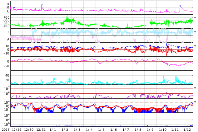 2026/ 1/31 08:59 更新 太陽風の速度は490km/秒に下がり、高速風は終わりそうです。磁気圏は穏やかです。 担当 篠原 太陽風の速度は、昨日のニュース以降も低下が続き、 600km/秒から490km/秒へゆっくり下がっています。 高速風の領域は通り過ぎて行きそうです。 磁場強度は4nTから3nTへ下がり、やや弱い状態です。 磁場の南北成分は、0nT付近で南北に細かく変化しています。 磁気圏は穏やかになっていて、 AE指数は小規模の変化が時々発生する程度です。 SDO衛星AIA193では、太陽の中心部にコロナホールは見られず、 太陽風はしばらく穏やかな状態になりそうです。 27日周期の図の前周期の太陽コロナ写真を見ると、 1月4日頃から北東側(左上)にコロナホールが現れています。 そろそろこの領域が見え始めて良い頃ですが、 現在はどの様になっているでしょうか。 太陽は、北東の端に新しい黒点が現れ、 小さい活動が度々発生しています。 規模が大きくなる様であれば注目して下さい。 X線グラフは、C1の小さい活動が起きている程度で、 全体としては穏やかです。