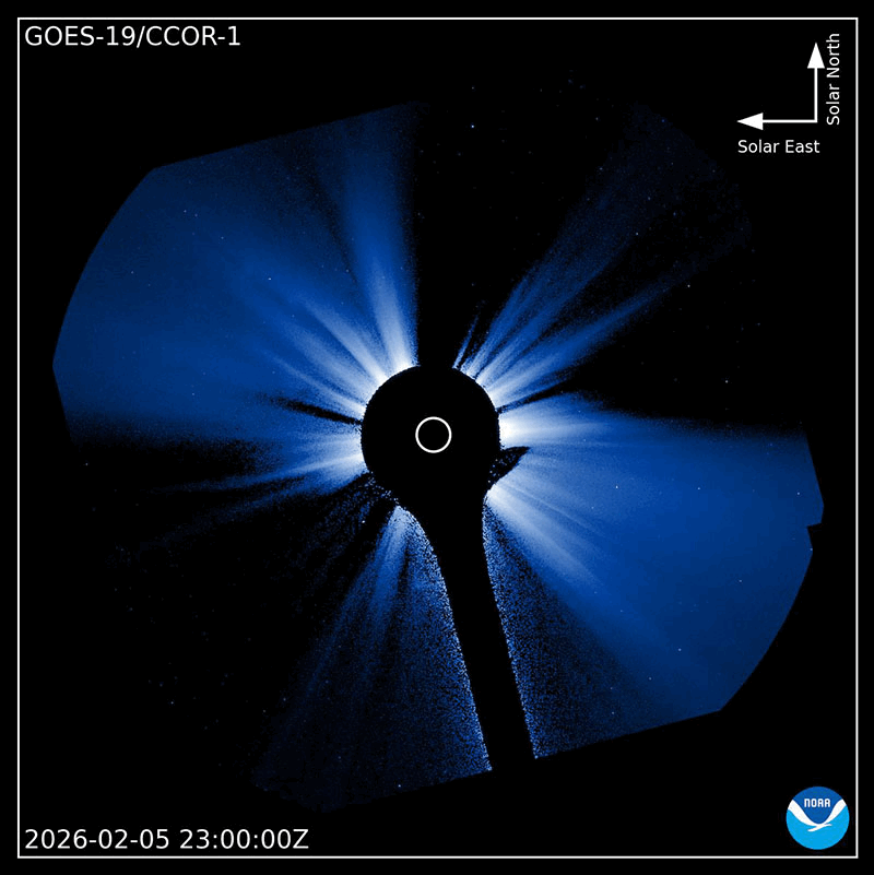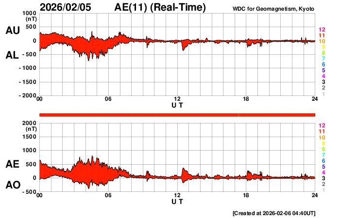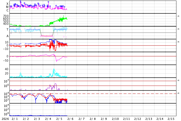 2026/ 2/ 6 13:59 更新 太陽風の速度は600km/秒に高まりました。太陽の向こう側でCMEが発生しています。 担当 篠原 太陽風の速度は、昨日のニュースの後も高まり続け、 500km/秒の状態から、今朝には600km/秒へ高まっています。 現在は少し下がって580km/秒ですが、高速の風が続いています。 これだけしっかりと高まると、CME(コロナ質量放出)というよりも、 コロナホールの様な高速風の吹き出し口が関係している様に思います。 太陽風の磁場強度は、15nTと強まった状態から、 現在は6〜7nTと平均的な値に下がっています。 磁場の南北成分は、 昨日のニュースのすぐ後に北向きに切り替わっていて、 磁気圏活動の強まりはあまり長く続きませんでした。 以降は北寄りの状態で、磁気圏は穏やかになっています。 AE指数は、初めのところに活動の強まりが発生していますが、 その後は変化が小さくなっています。 SDO衛星AIA193では、 北半球の高緯度側にコロナホールが見えています。 緯度が高いですが、影響はどうなるでしょうか。 太陽の向こう側で、ある程度規模の大きい活動が発生した様で、 今朝、6日8時(世界時5日23時)頃に、 太陽の左上に大きく広がるCMEが発生しています。 SOHO衛星LASCO C2、GOES衛星CCOR-1の動画を掲載します。 太陽の北西(右上)の4366黒点群は、 M1〜2の中規模フレアが7回ほど発生しています。 活発な状態は続いていますが、フレアの規模は小さくなっています。 また、南西(右下)の4362群の活動が強まっていて、 昨夜から、C6.0、M1.8、M2.2と、 小規模、中規模のフレアを起こす様になっています。