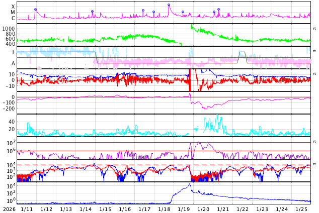 GOES衛星の太陽X線強度。赤・橙 = 0.1〜0.8 nm、青・紫 = 0.05〜0.4 nm (c) データ:NOAA/SWPC、作図:宇宙天気ニュース ![]() | ||||||||||||||||||||||||||||||||||||||||||||||||||||||||||||||||||||||||||||||||||||||||||||||||||||||||||||||||||||||||||||||||||||||||||||||||||||||||||||||||||||||||||||||||||||||||||||||||||||||||||||||||||||||||||||||||||||||||||||||||||||||||||||||||||||