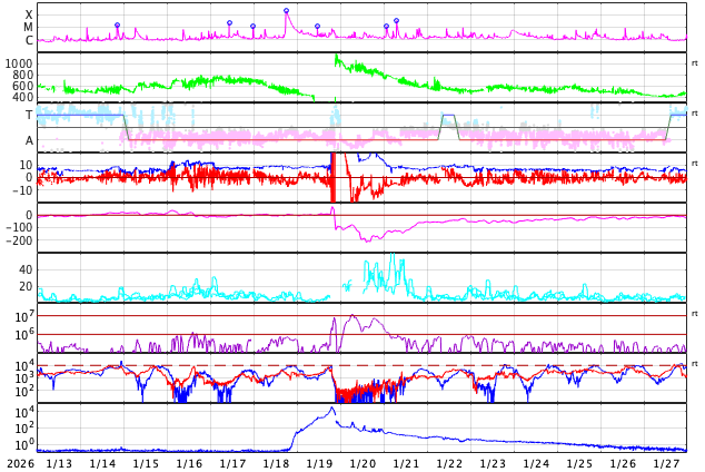 GOES衛星の太陽X線強度。赤・橙 = 0.1〜0.8 nm、青・紫 = 0.05〜0.4 nm (c) データ:NOAA/SWPC、作図:宇宙天気ニュース ![]() | ||||||||||||||||||||||||||||||||||||||||||||||||||||||||||||||||||||||||||||||||||||||||||||||||||||||||||||||||||||||||||||||||||||||||||||||||||||||||||||||||||||||||||||||||||||||||||||||||||||||||||||||||||||||||||||||