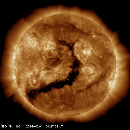 2026/ 2/14 14:16 更新 太陽風磁場が南寄りになって、磁気圏活動が度々発生しています。 担当 篠原 太陽風の速度は、400km/秒から470km/秒へ少し上がっています。 磁場強度は、7〜8nTと少し強まった状態です。 磁場の南北成分は、-5nTと南向きに強まる変化が起きています。 磁気圏の活動もある程度強まって、 AE指数は500nTの中規模の変化が度々発生しています。 グラフの最後は北向きになっていますが、 この後はどのように推移するでしょうか。 SDO衛星AIA193では、 太陽の中心部から南東の端(左下)に向かって コロナホールが細長く伸びています。 明後日くらいから太陽風の速度が高まりそうです。 太陽は、北西(右上)の4373黒点群で M1.0の中規模フレアが発生しました。 その他は特に変化はなく、全体として太陽は穏やかです。 可視光写真では、小さい黒点があちこちに新しく現れています。 ![]() SDO衛星のAIA193カメラによる太陽コロナの様子 (c) SDO (NASA) ![]() SDO衛星による太陽の可視光写真。マウスの矢印を写真に重ねると、黒点番号付きの写真に切り替わります。 (c) SDO (NASA) ![]() ACEが観測した太陽風の磁場(黒線は全体の強度、赤線は南北成分) 磁場の向き、プラズマの密度、速度、温度 (c) データ:NOAA/SWPC、作図:宇宙天気ニュース ![]() AE指数(速報値) 下段のAEグラフの値が高くなると、オーロラ活動が活発化しています。 (c) 京都大学WDC ![]() ![]() 27日の太陽周期に合わせた図 太陽が同じ面を地球に向けていた27日前の変化から、今後を予想することができます。 (c) 作図:宇宙天気ニュース