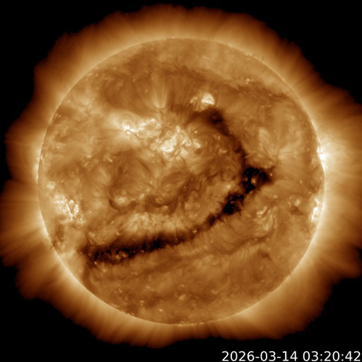2026/ 3/14 13:20 更新 高速の太陽風が到来して、速度が650km/秒に高まっています。磁気圏の活動も強まっています。 担当 篠原 昨夜から太陽風の速度が高まり始め、 650km/秒の高速風が到来しています。 ACE衛星のグラフを見ると、 昨夕、13日17時(世界時13日8時)頃から速度が高まり始め、 13日21時(世界時13日12時)頃に500km/秒に達し、 その後も速度の上昇が続いて、 今朝、14日5時(世界時13日20時)頃に650km/秒に達しています。 GOES衛星SUVI 195の太陽コロナ写真で、 太陽の中心部の西側(右側)から南東の端(左下)へ 細長く伸びているコロナホールの影響がやって来た様です。 27日周期の図では、前周期も2月15日頃から速度が高まっていますが、 今回はもう少し早いタイミングで回帰しました。 太陽風の磁場強度は、8〜12nTの間を上下して、 強まった状態になっています。 南北成分は、グラフの中盤は北寄りですが、 後半は南寄りになり、-5nTを超える変化が続いています。 速度の高まりと重なって磁気圏の活動は活発になっています。 AE指数は、1000nT程度の変化が連続的に発生しています。 この後も磁場が南寄りで推移すると、 磁気圏の活動も活発な状態が続くでしょう。 太陽風のグラフの最後を見ると、 速度は600km/秒に少し下がり、 磁場の南北成分は0nT付近に変化しています。 この後はどの様な変化になるでしょうか。 昨日のニュースで紹介した 太陽の南側で発生したフィラメント噴出によるCME(コロナ質量放出)の様子を SOHO衛星LASCO C2、C3の動画で紹介します。 コロナのガスは太陽の下側に向かって広がっています。 地球への影響はなさそうです。 太陽では、北西の端(右上)に達した4384黒点群で、 M1.2の中規模フレアやC7.4の小規模フレア、 その近くの領域でC8.0の小規模フレアが発生しています。 4384群は、この後見えなくなります。 また、南東の4392群でC8.9の小規模フレアが発生しています。
