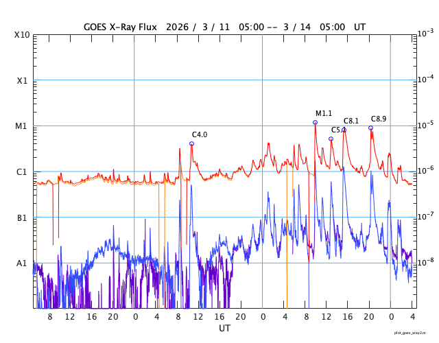 GOES衛星の太陽X線強度。赤・橙 = 0.1〜0.8 nm、青・紫 = 0.05〜0.4 nm (c) データ:NOAA/SWPC、作図:宇宙天気ニュース ![]() | |||||||||||||||||||||||||||||||||||||||||||||||||||||||||||||||||||||||||||||||||||||||||||||||||||||||||||||||||||||||||||||||||||||||||||||||||||||||||||||||||||||||||||||||||||||||||||||||||||||||||||||||||||||||||||||||||||||||||||||||||||||||||||||||||