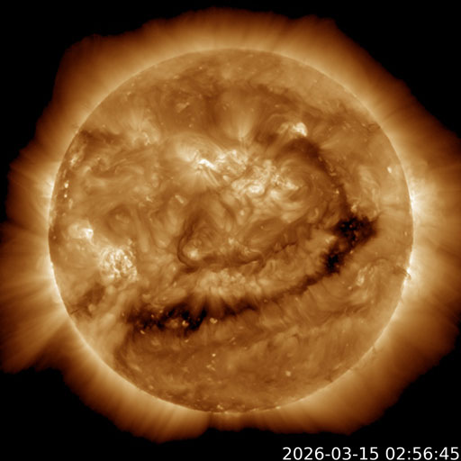 2026/ 3/15 12:54 更新 太陽風は650km/秒の高速風が続いています。磁気圏も活動的です。 担当 篠原 太陽風の速度は、昨日のニュースの後に650km/秒へ再び高まり、 その後、700km/秒まで上がりました。 今日の未明から少し下がっていますが、 現在も650km/秒とかなり高まった状態が続いています。 磁場強度は、12nTと強まった状態から 5nTと平均的な値へ下がっています。 高速風の領域としては中盤に入ったと言えそうです。 磁場の南北成分は、 グラフの途中から北寄りに変わっています。 磁気圏の活動は続いていて、 AE指数は1000nTに達する大きい変化が度々発生しています。 ただし、AE指数のグラフの最後は変化がなくなっています。 この後は活動の規模が小さくなりそうです。 GOES衛星SUVI 195では、 コロナホールは太陽の西側(右側)から南東(左下)へ 細長く伸びています。 27日周期の図の前周期の写真と比較すると、 広がりは細くなっています。 このため、この後の太陽風速度の高まりは、 前周期よりも弱くなるかもしれません。 注目して下さい。 太陽は、北西の端(右上)でC1の小さい変化が多く発生しています。 こちら側の領域では、 中心部北東(左上)の4393黒点群でC1.5、C1.7、 南東の4395群でC2.4の小規模フレアが発生した程度です。 ![]() GOES衛星のSUVI 195カメラによる太陽コロナの様子 (c) NOAA/SWPC ![]() SDO衛星による太陽の可視光写真(SOHO衛星の画像ページより取得)。 マウスの矢印を写真に重ねると、黒点番号付きの写真に切り替わります。 (c) SDO (NASA) ![]() ACEが観測した太陽風の磁場(黒線は全体の強度、赤線は南北成分) 磁場の向き、プラズマの密度、速度、温度 (c) データ:NOAA/SWPC、作図:宇宙天気ニュース ![]() AE指数(速報値) 下段のAEグラフの値が高くなると、オーロラ活動が活発化しています。 (c) 京都大学WDC ![]() ![]() 27日の太陽周期に合わせた図 太陽が同じ面を地球に向けていた27日前の変化から、今後を予想することができます。 (c) 作図:宇宙天気ニュース
