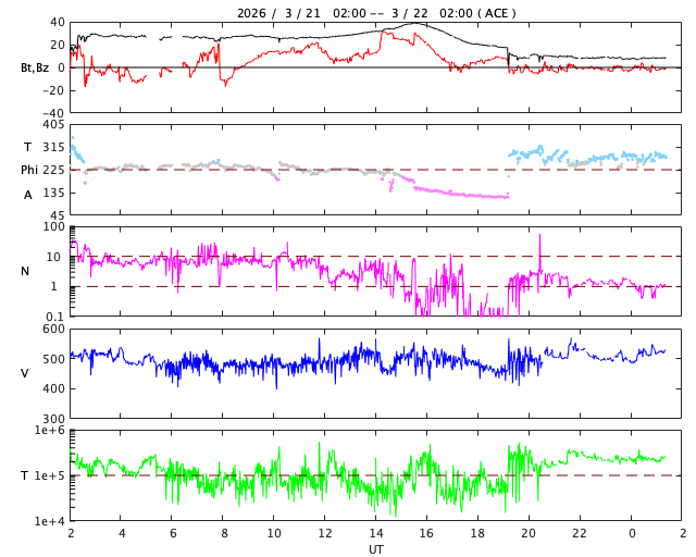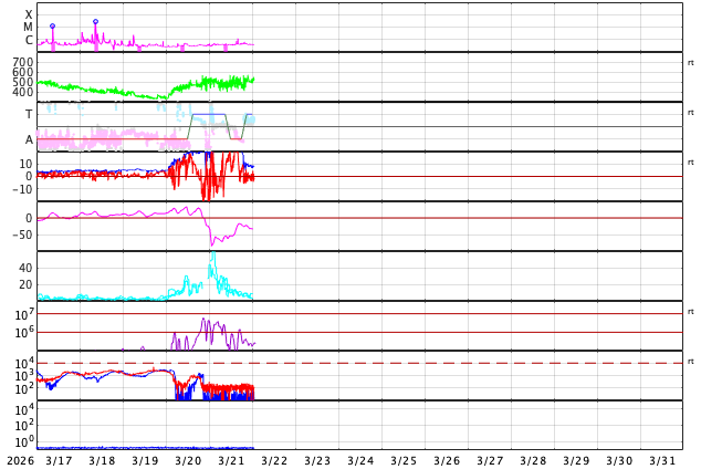 2026/ 3/21 10:17 太陽風の速度は500km/秒に高まり、磁気圏の活動が活発になっています。