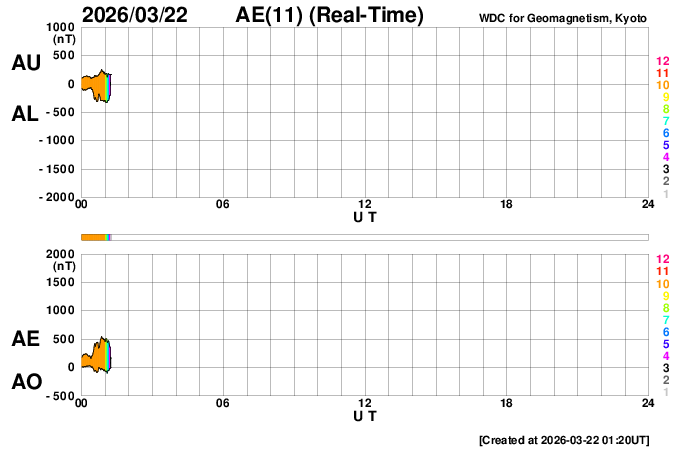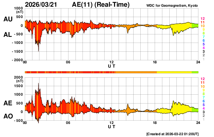 下段のAEグラフの値が高くなると、オーロラ活動が活発化しています。