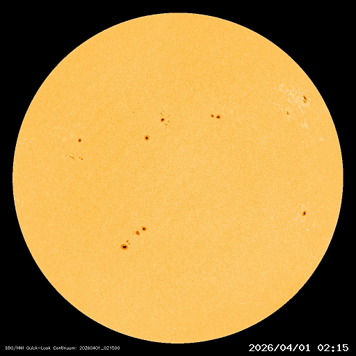 2026/ 4/ 1 12:27 更新 太陽風の速度はやや低速になっています。CMEによる乱れはまだ到来していません。 担当 篠原 太陽風の速度は、430km/秒から380km/秒へ少し下がり、 やや低速になっています。 磁場強度は、5nTと平均的な状態です。 30日に発生したCME(コロナ質量放出)による太陽風の乱れは、 まだ到来していません。 フレアの発生から2日が経過しているので、 乱れの速度は、普通の高速風くらいになるのではないでしょうか。 太陽風磁場の南北成分は、 小幅で北を向いたり南を向いたりしています。 南を向いた頃に磁気圏の活動がある程度強まって、 AE指数では、500nT程度の変化が発生しています。 GOES衛星SUVI 195では、 太陽中心部のコロナホールは西側(右側)に少し進んでいます。 見える位置から考えると、明日くらいから影響が始まりそうですが、 その前にCMEの乱れが始まりそうです。 引き続き注目して下さい。 太陽は、C1の小さい小規模フレアが数回発生した程度で、 穏やかな状態です。 一方、可視光写真では黒点群が10群も見えていて、 賑やかな状況です。