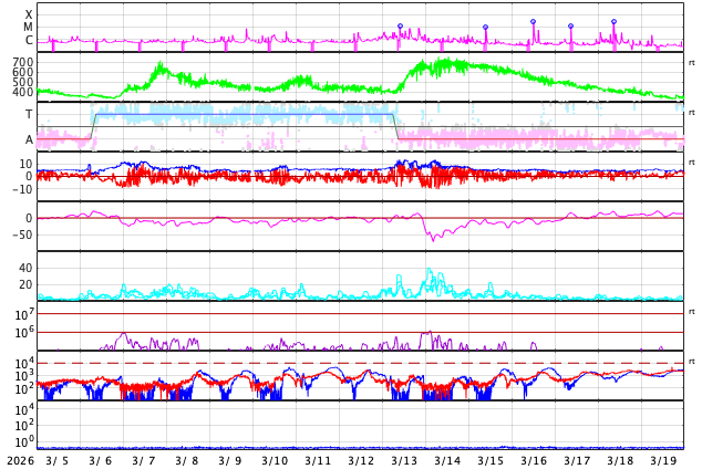 GOES衛星の太陽X線強度。赤・橙 = 0.1〜0.8 nm、青・紫 = 0.05〜0.4 nm (c) データ:NOAA/SWPC、作図:宇宙天気ニュース ![]() | ||||||||||||||||||||||||||||||||||||||||||||||||||||||||||||||||||||||||||||||||||||||||||||||||||||||||||||||||||||||||||||||||||||||||||||||||||||||||||||||||||||||||||||||||||||||||||||||||||||||||||||||||||||||||||||||||||||||||||||||||||||||||||||||||||||||||||||||||||||||||||||